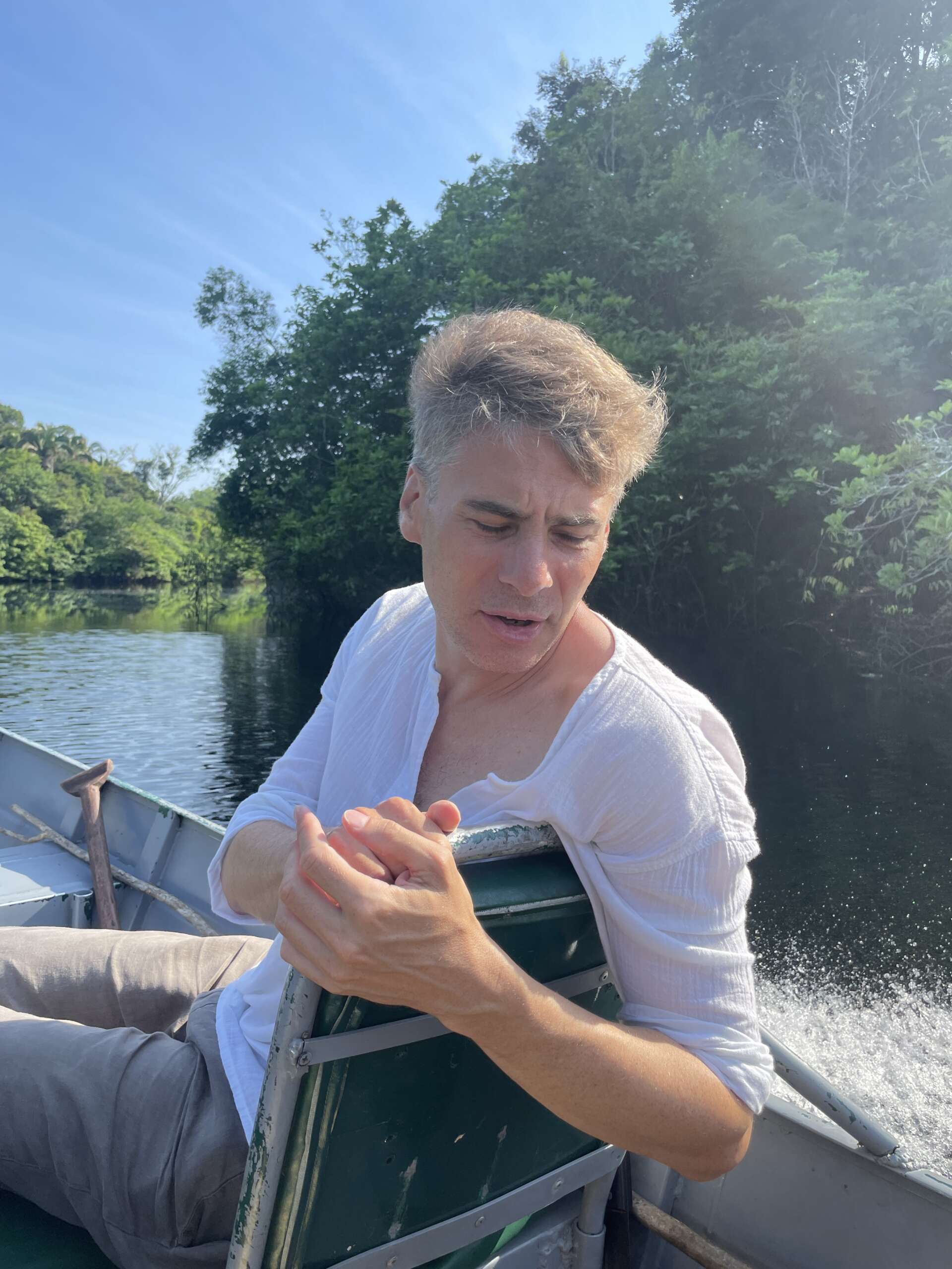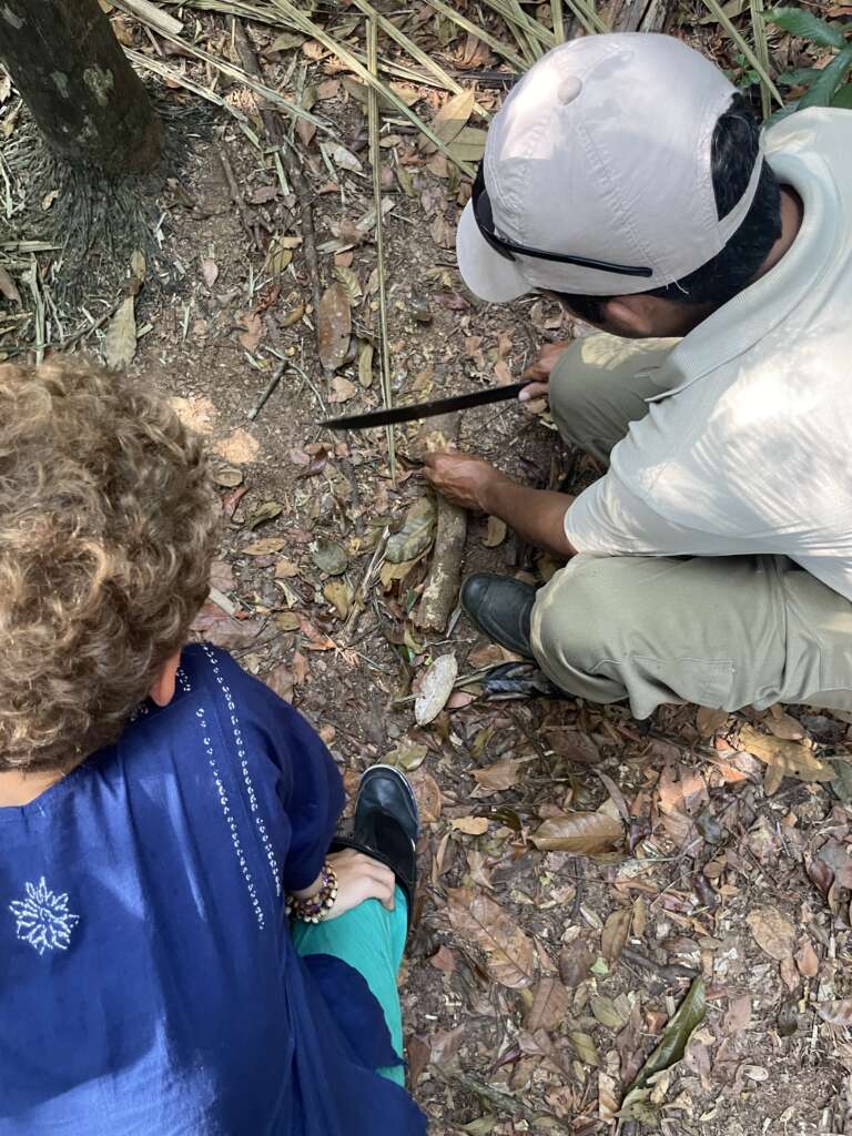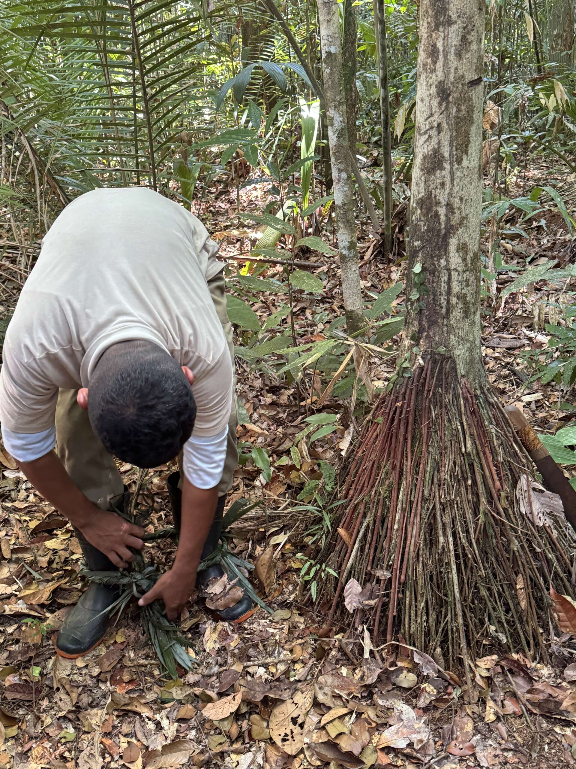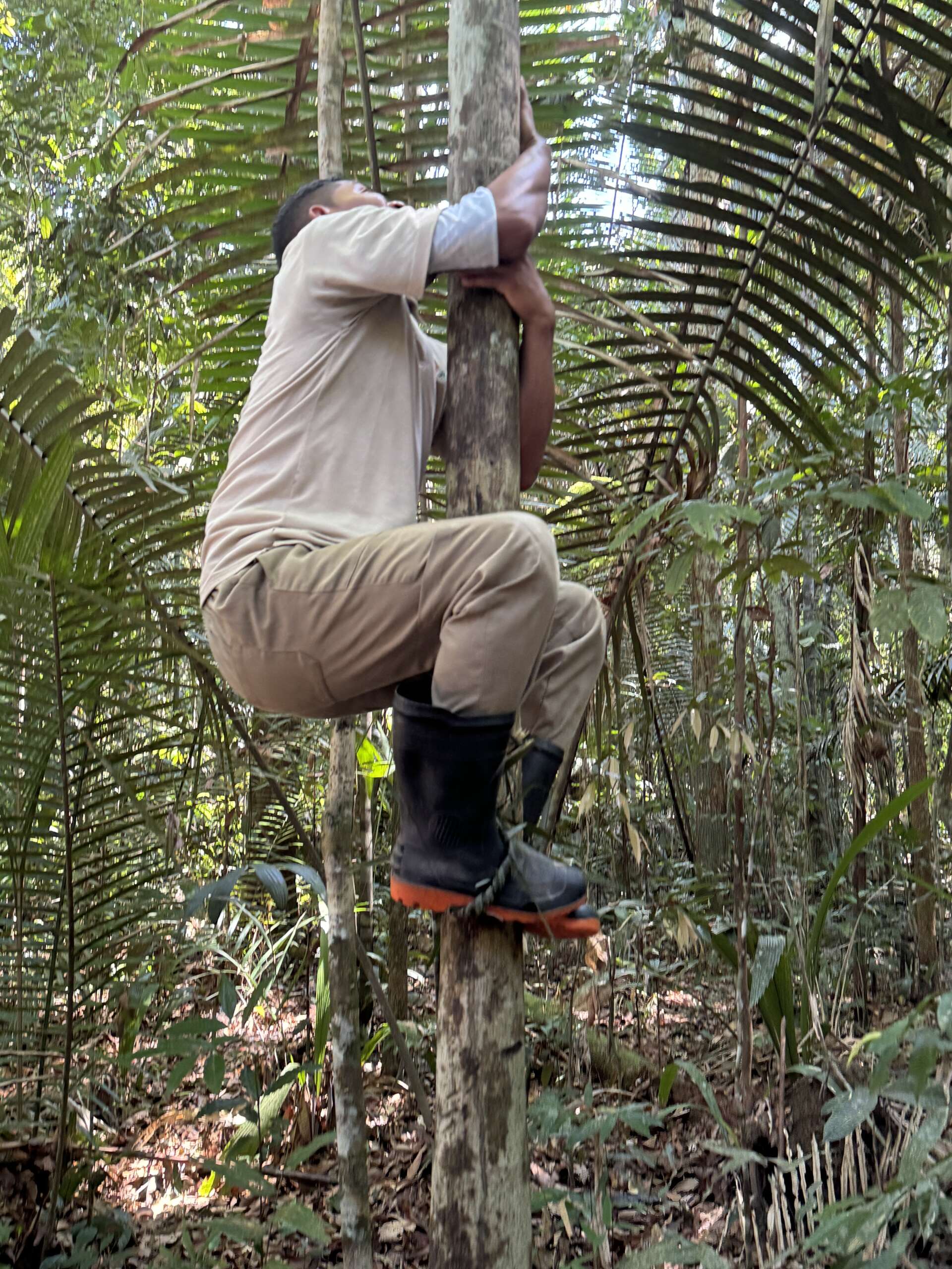 Autre histoire ahurissante, la cueillette d’un des fruits les plus répandus ici, le Acai. En tant que tel, rien d’effrayant me direz-vous. Ralf demande à son collègue de nous faire une démonstration de comment aller chercher les fruits situés à plus de 20 mètres du sol. Avec une feuille de palme tressée, il se constitue une corde, puis en fait un cercle qu’il se passe aux chevilles et qui l’aide à monter à l’arbre, comme le font beaucoup d’indigènes sur la planète pour aller chercher des noix de coco.
