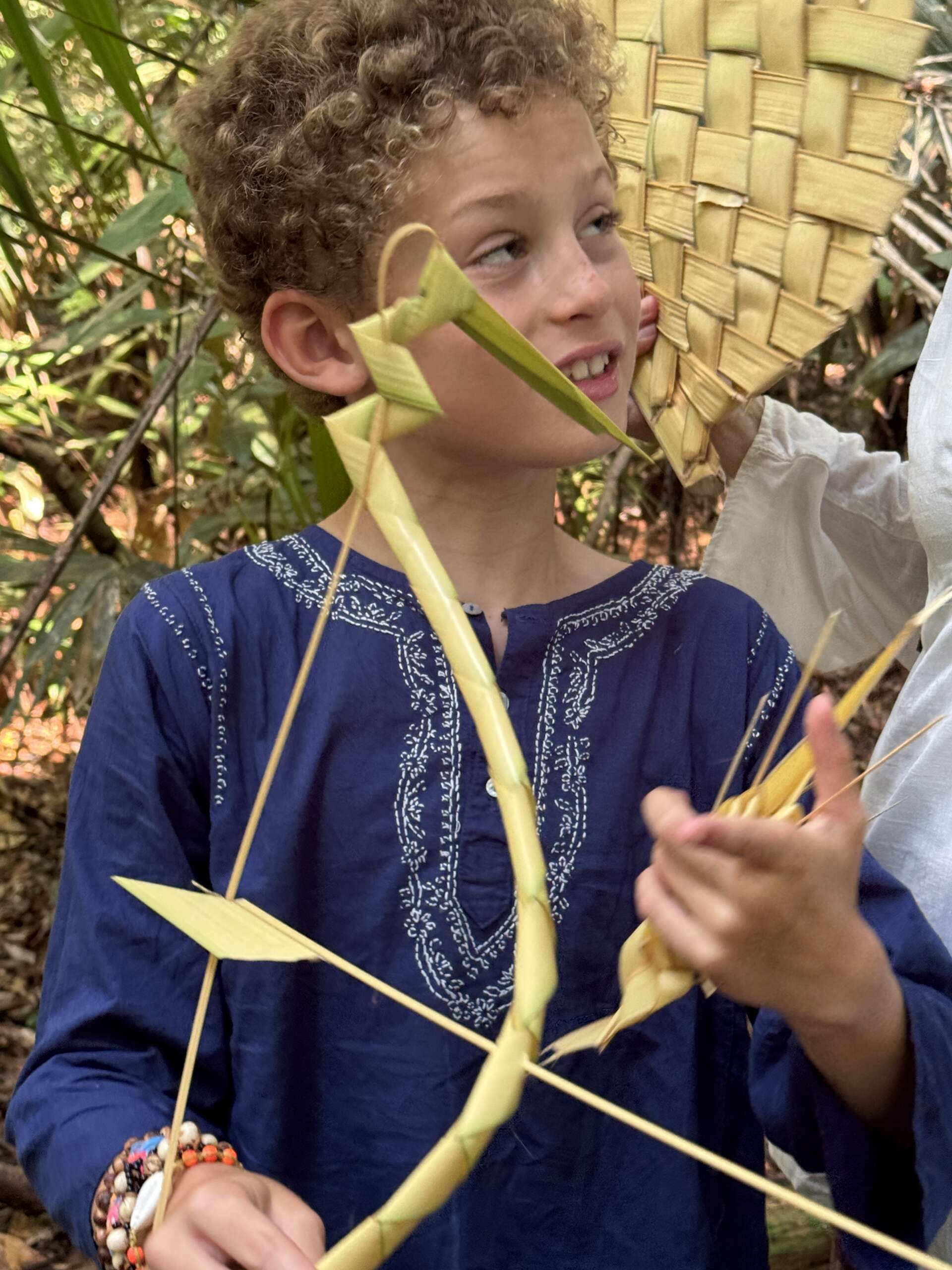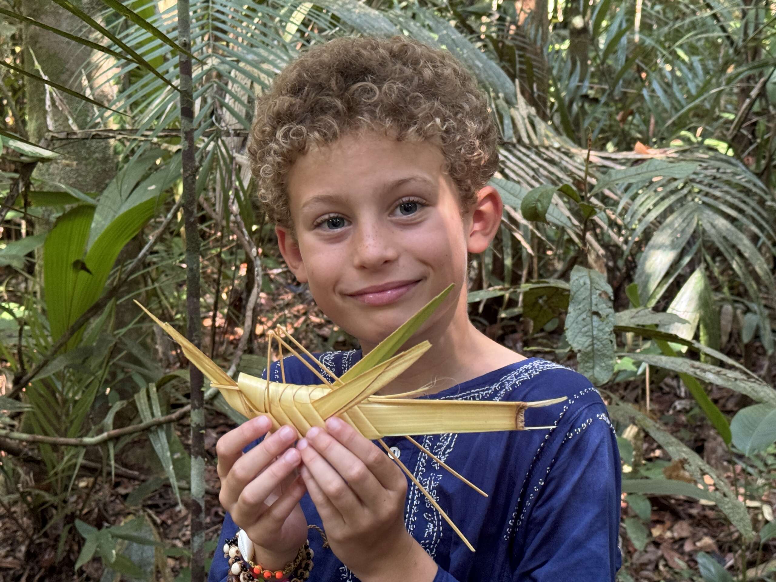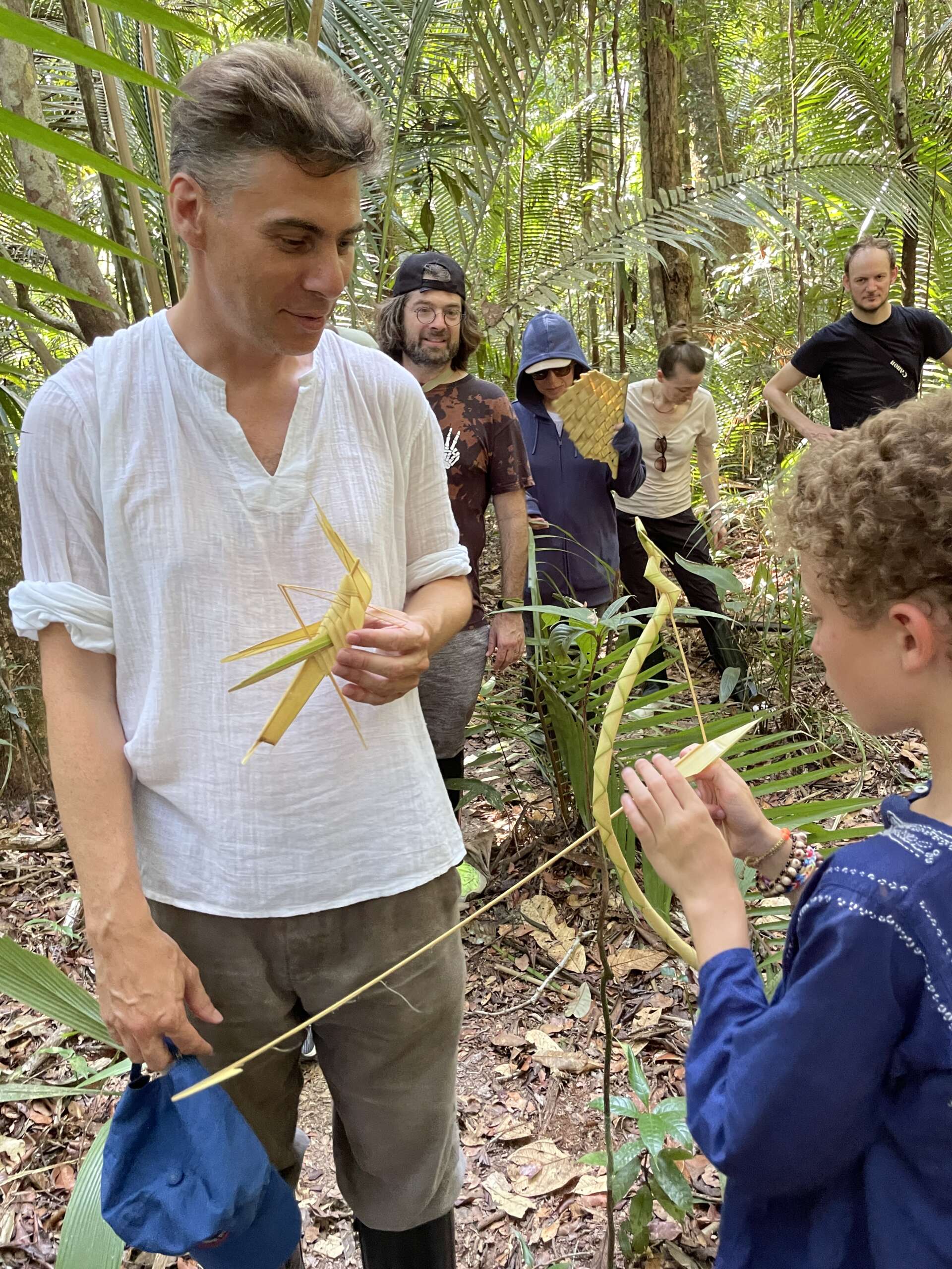 Je reviens à nos moutons. On était dans la forêt et comme il y a des palmiers un peu partout, voila Ralf qui en profite pour faire montrer aux russes par son aide de camp le tressage et pendant ce temps, se met à confectionner un encore plus beau criquet qu’il donne à Noah. Déjà heureux, Noah se voit ravi quand Ralf poursuit ses confections et lui fabrique cette fois un arc et une flèche, et une nouvelle couronne pour Virginie.. Pour la petite histoire, à la fin de la marche il aura aussi fait une couronne à Noah. C’est bon, en rentrant à Manaus on peut ouvrir notre propre boutique d’artisanat désormais !