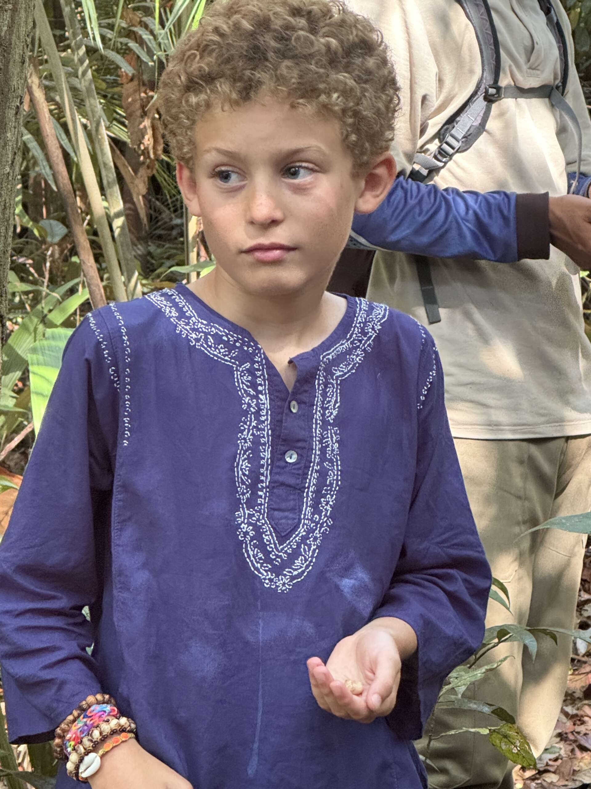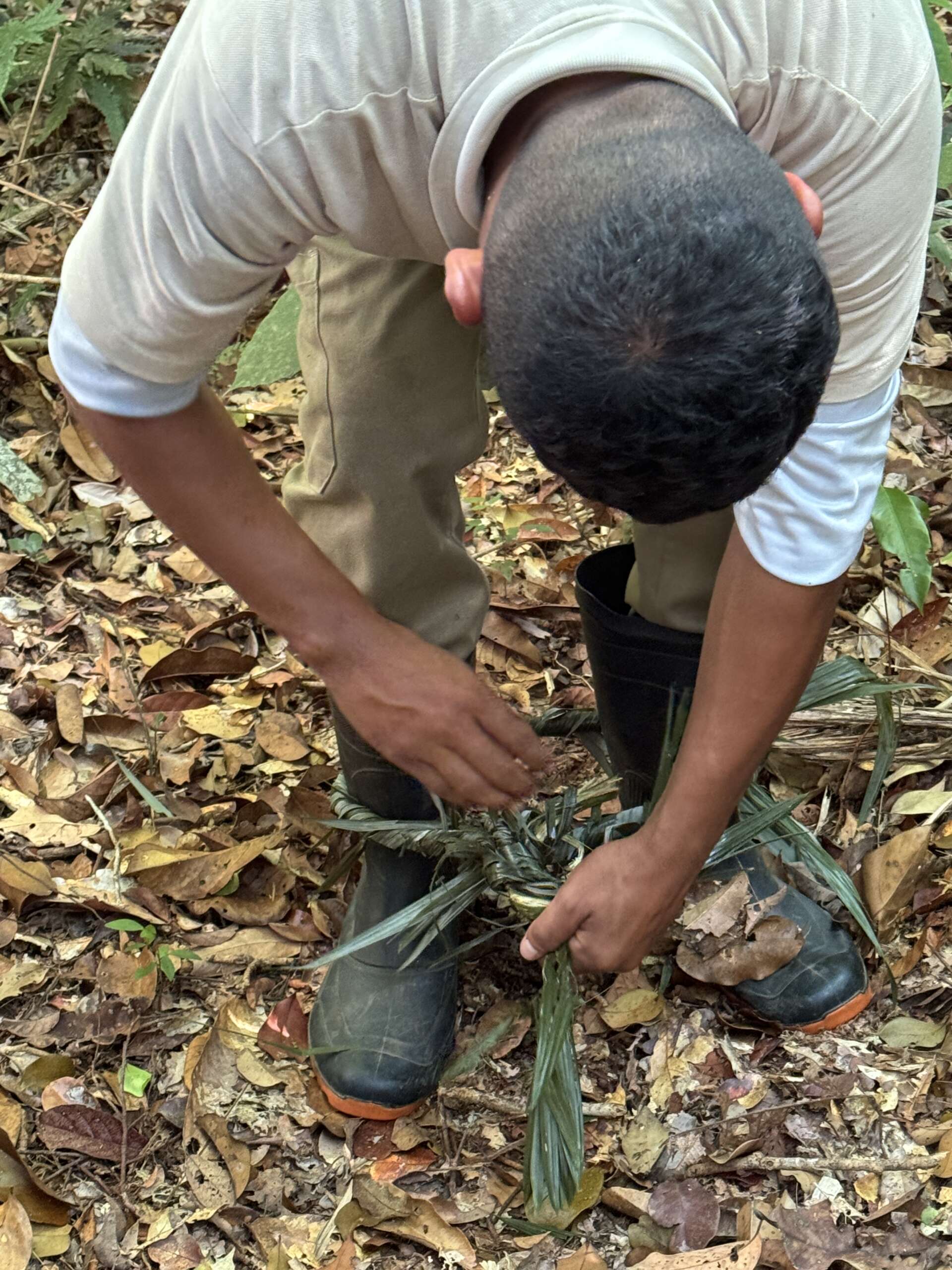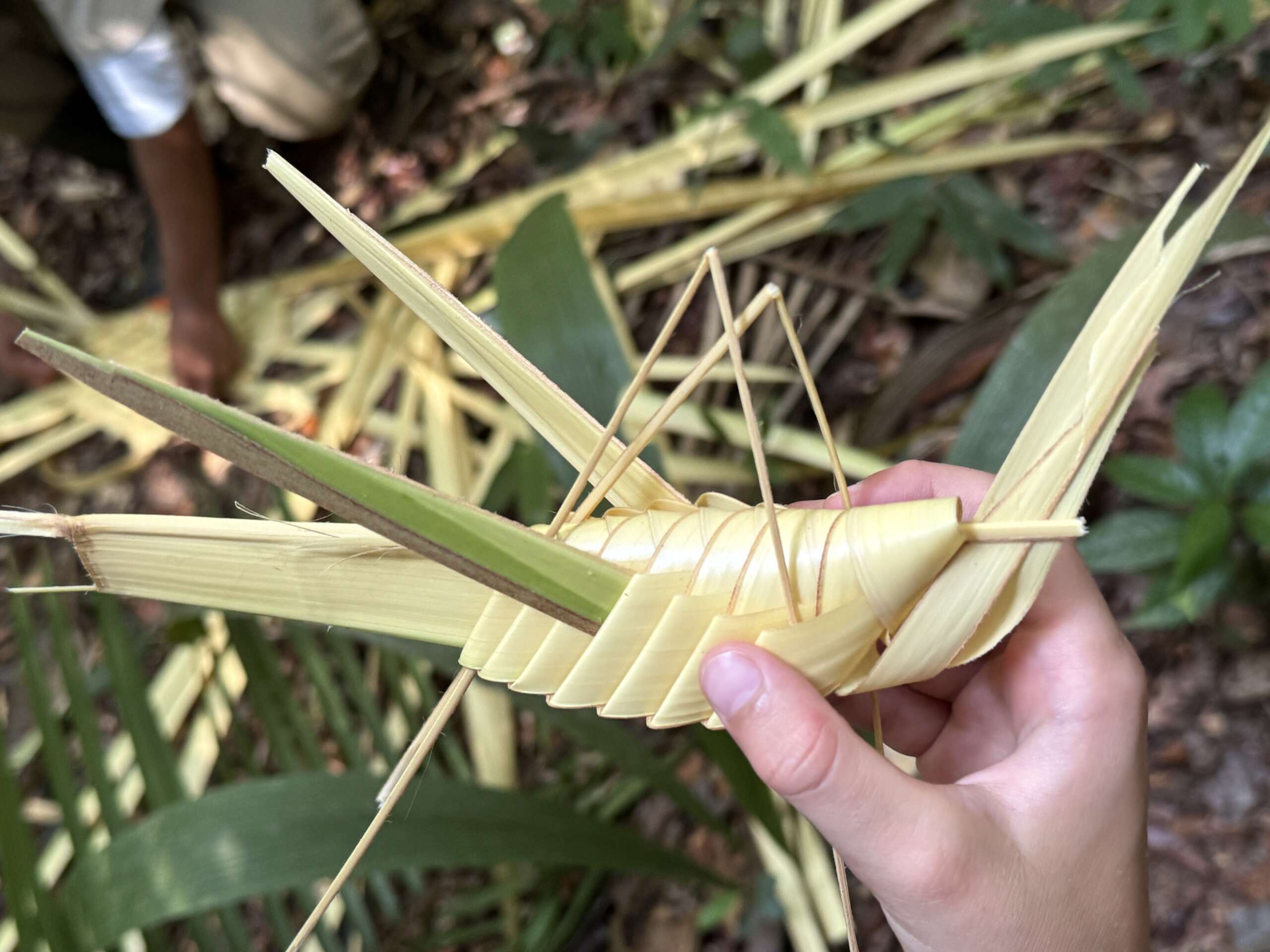 Je reviens à nos moutons. On était dans la forêt et comme il y a des palmiers un peu partout, voila Ralf qui en profite pour faire montrer aux russes par son aide de camp le tressage et pendant ce temps, se met à confectionner un encore plus beau criquet qu’il donne à Noah. Déjà heureux, Noah se voit ravi quand Ralf poursuit ses confections et lui fabrique cette fois un arc et une flèche, et une nouvelle couronne pour Virginie.. Pour la petite histoire, à la fin de la marche il aura aussi fait une couronne à Noah. C’est bon, en rentrant à Manaus on peut ouvrir notre propre boutique d’artisanat désormais !