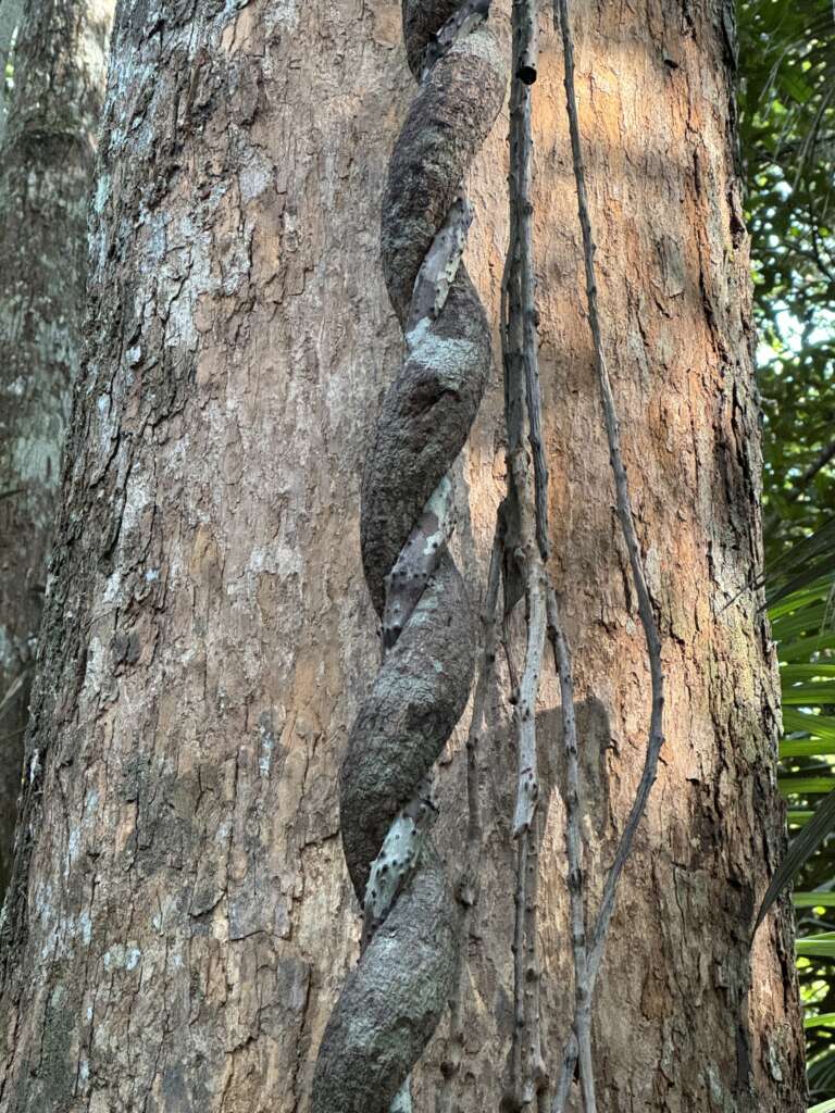 On tombe à nouveau sur une myriade de choses improbables. Des lianes et racines en symbioses qui s’entremêlent (l’une descendant de l’arbre tandis que l’autre, au contraire, monte).