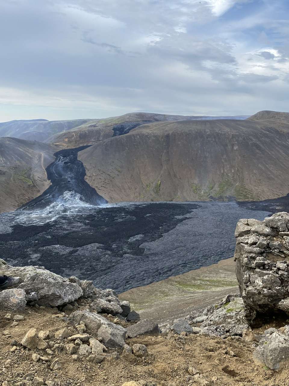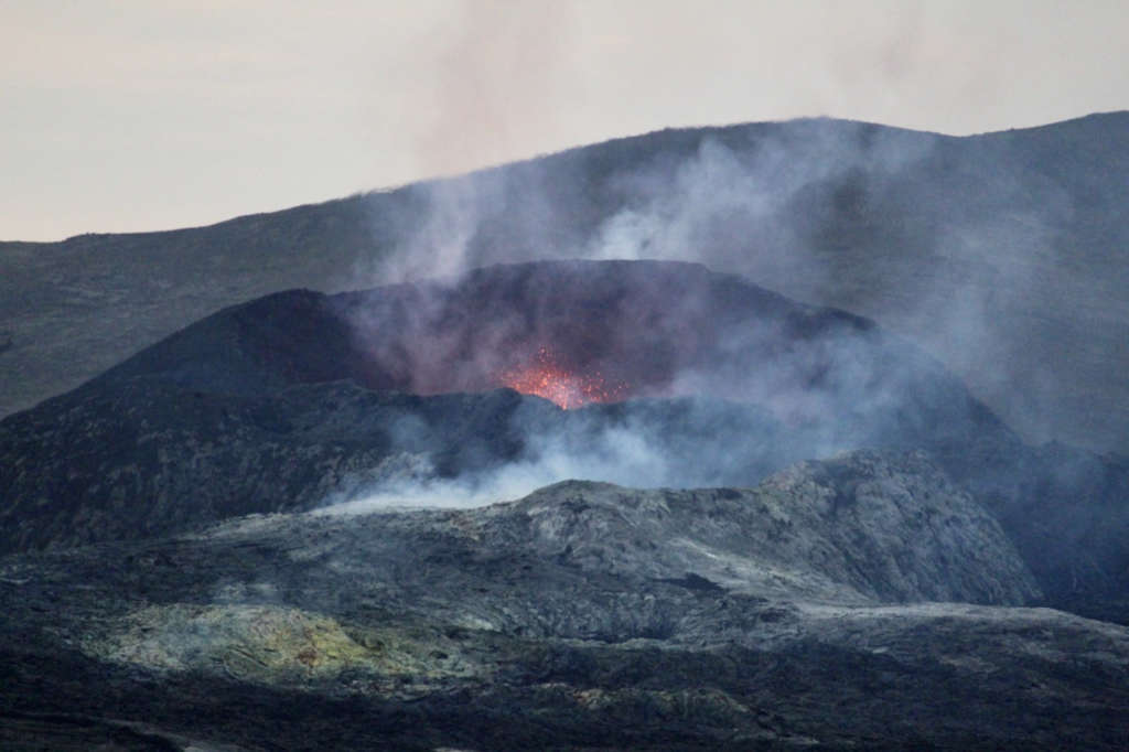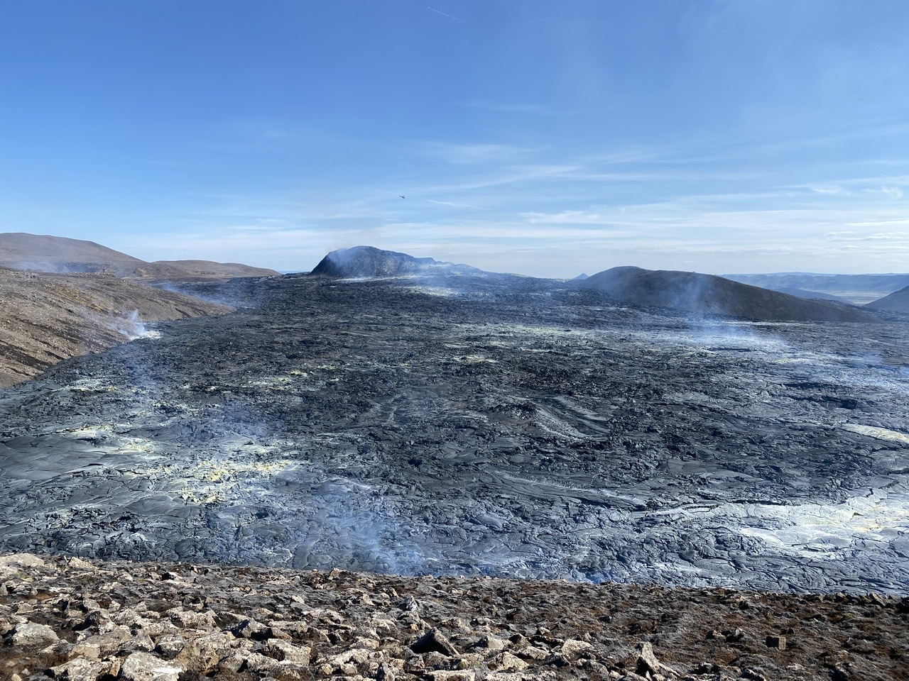 On est exactement de l’autre côté de ce matin. On est d’ailleurs techniquement un peu plus loin du cratère mais cette fois on le surplombe et surtout celui-ci semble en partie ouvert de notre côté, là où la lave n’a cessé de se déverser depuis des mois.