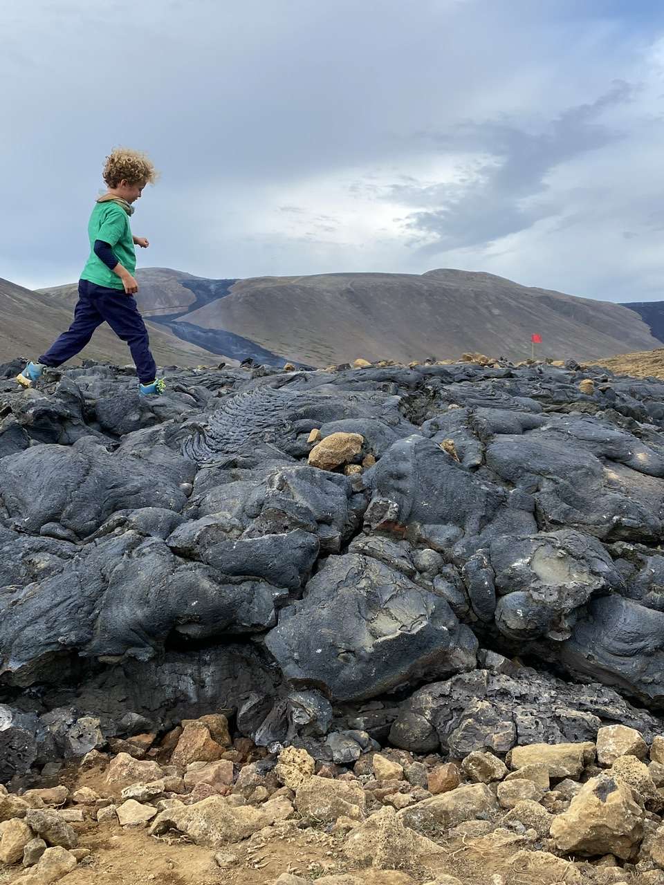 Noah s’élance avec enthousiasme en contrebas pour marcher sur la lave. Elle est encore chaude, voir très chaude par endroit. On voit parfaitement les dessins de la lave visqueuse qui s’est progressivement arrêtée en fonction de la topographie des lieux.