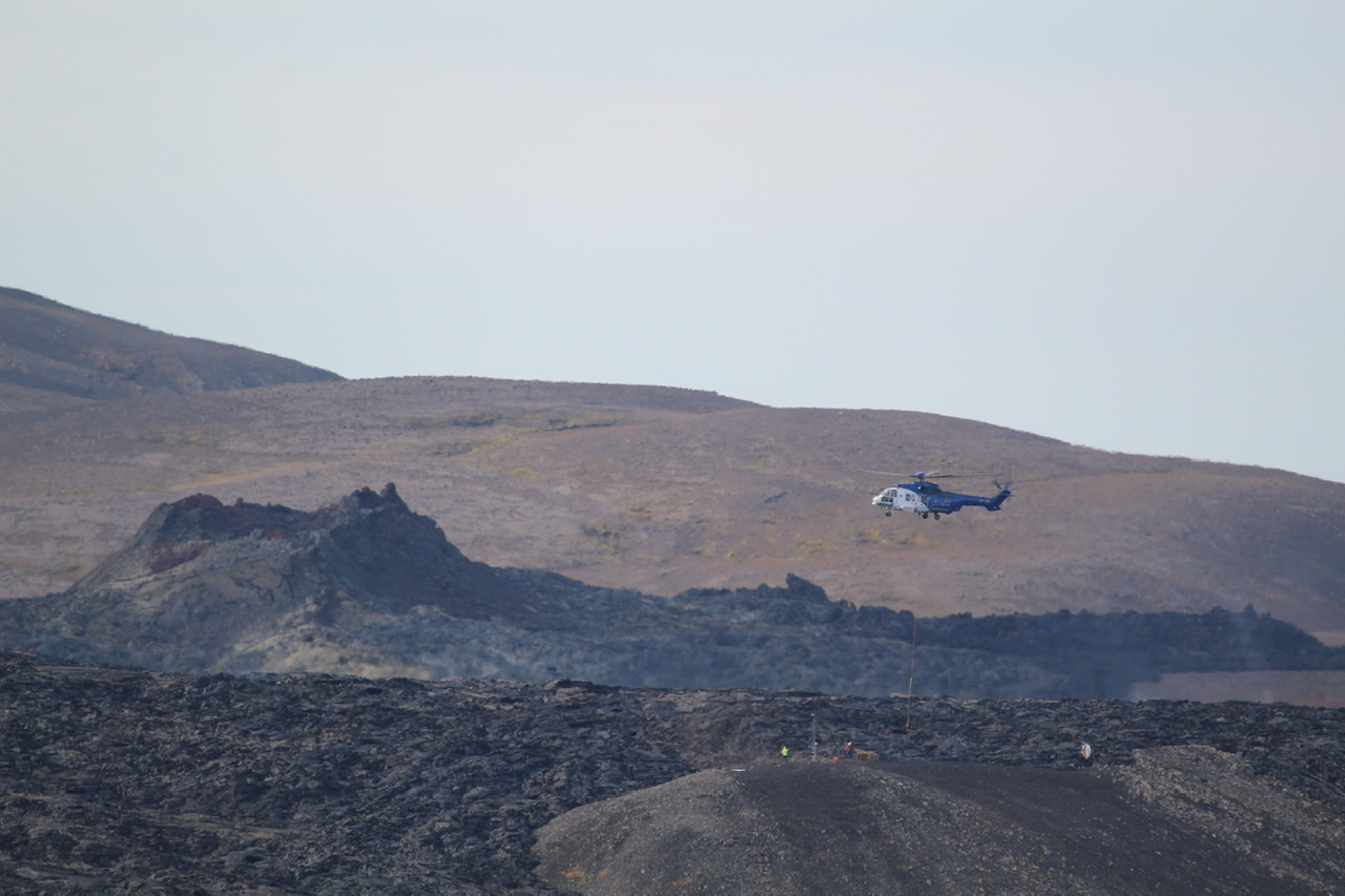 19h30 toujours rien. De nombreuses personnes se sont disséminées le long de la crête et on voit que eux aussi au vu de l’heure et de l’inactivité apparente s’interrogent sur la pertinence de rester ou non. Nous pareil, sauf qu’en plus Noah est maintenant monté sur ressort et tourne en rond ou pour être plus précis cours partout près de la falaise. J’ai fini par trouver un rocher plat (le problème avec les roches volcaniques c’est qu’elles sont toutes tranchantes et qu’elles sont à peu près aussi agréables que les chaises du restau l’Avenue, avenue Montaigne dont le patron m’avoua un jour que si ses chaises étaient légèrement inclinées, c’était pour qu’elle deviennent inconfortables après 1h et qu’elles poussent les gens à se barrer et à libérer les tables). J’avais donc réussi à allonger Noah contre moi, et on patientait plus ou moins tranquillement depuis 10 minutes. en regardant un hélicoptère s’approcher du cratère et déposer du matériel et des scientifiques à proximité du cratère.