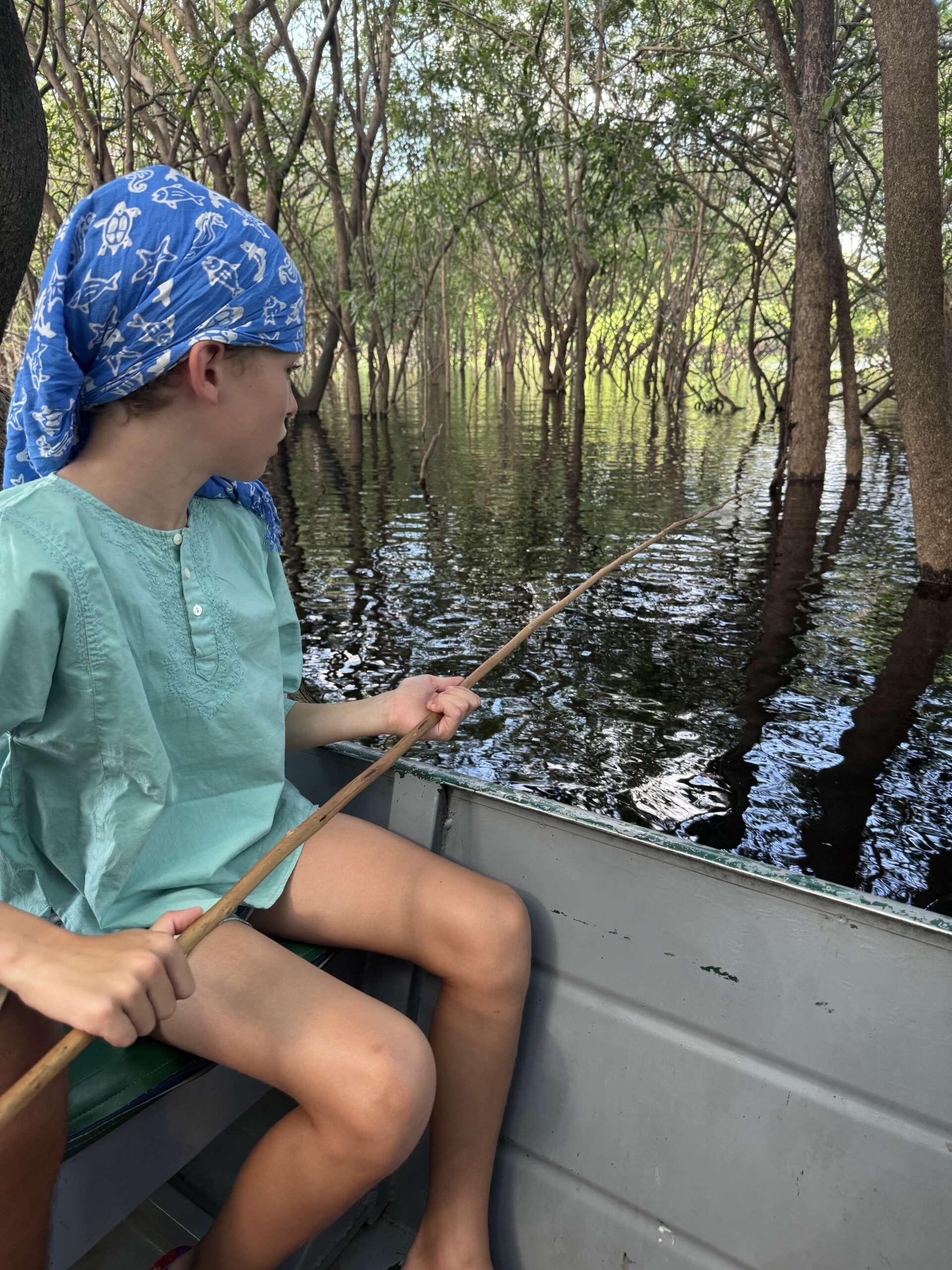 Alors, pour pécher les piranhas, rien de plus simple. On est dans notre petit bateau, la canne à pêche se résume à une petite perche en bois, un fil, un hameçon (bon en même temps c’est plutôt normal ça non ? ) Comme appât, des petits morceaux de viande bien sûr. On pêche des piranhas ouuuu biennnn ? (c’est pour faire l’accent Suisse qu’aime bien Noah et Virginie). Et pour attirer le piranha, tu agites frénétiquement l’eau avec ta canne pour mimer un singe qui tombe dans l’eau et qui se débat.