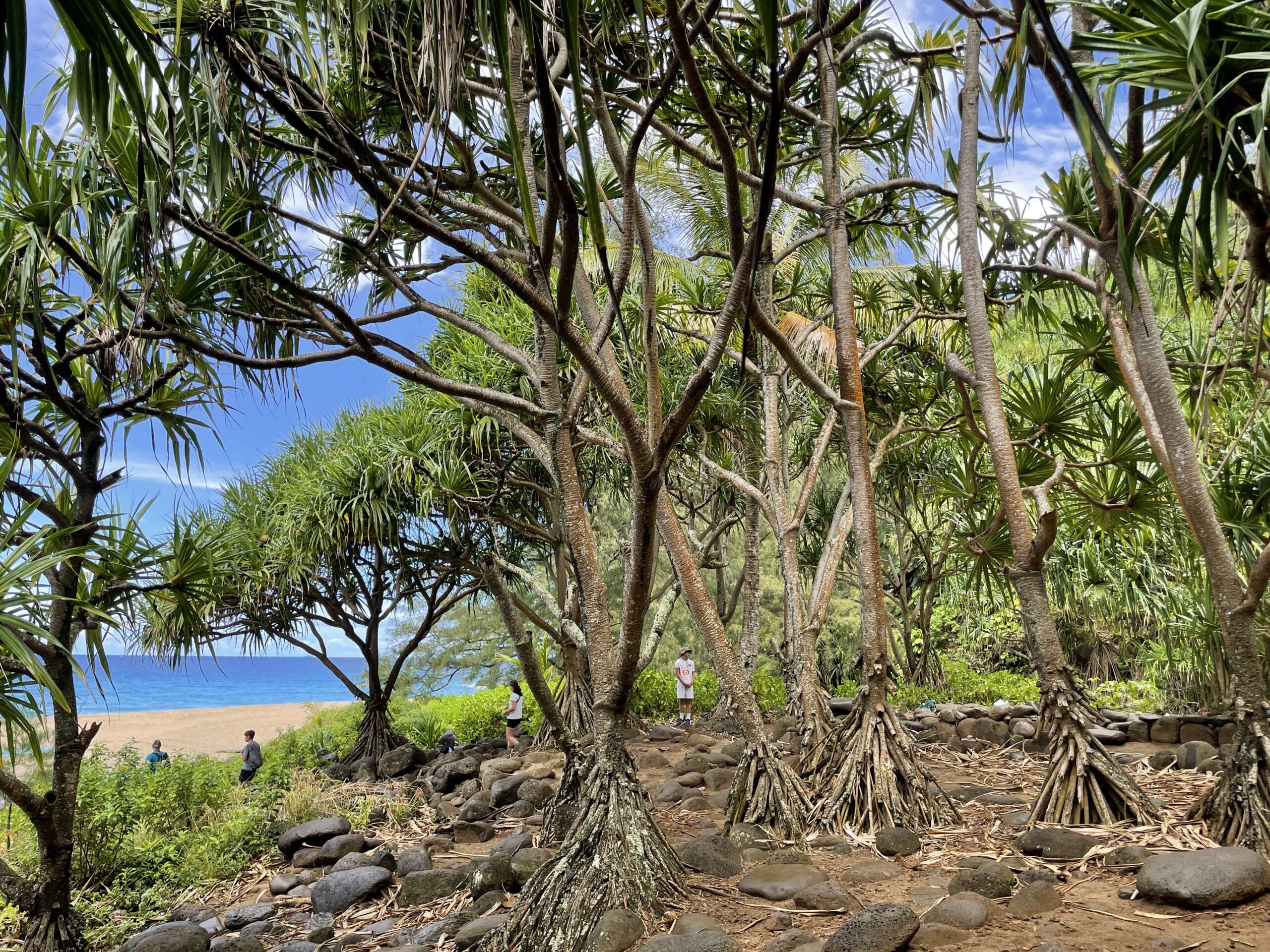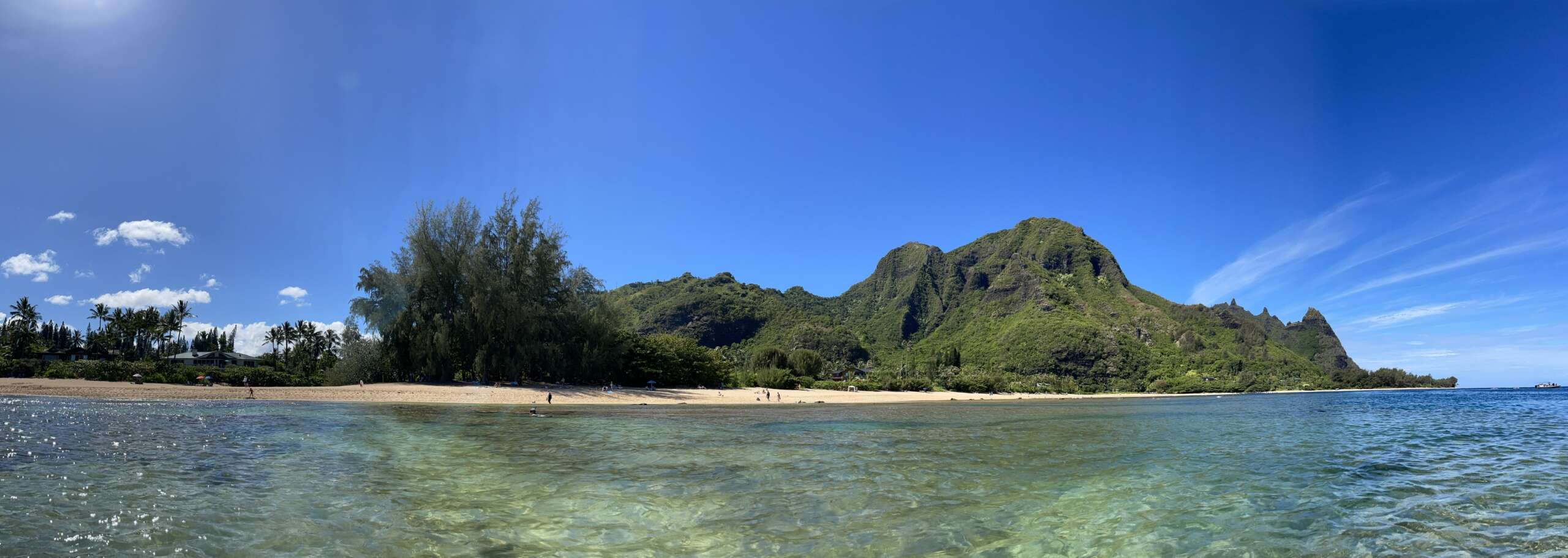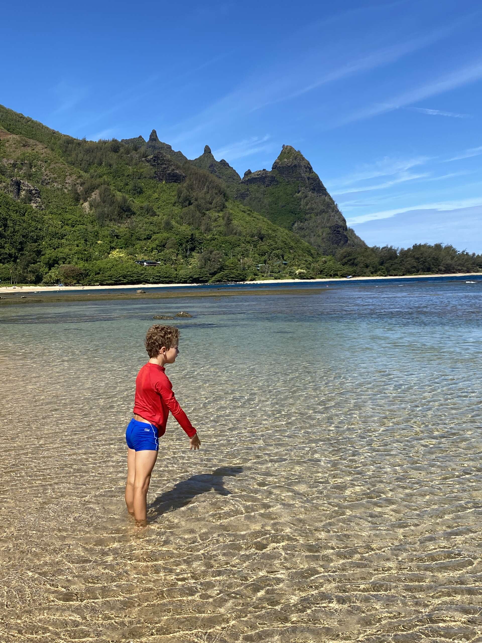 On s’installe sous des pins, la plage est en effet très sympa. Vue magistrale sur les ridges de la Napali coast qui débute à quelques kilomètres de là. L’eau est crystalline. Un petit passage permet de se faufiler entre des bancs de sable pour aller faire du snorkeling. C’est l’occasion de permettre Noah de se refamiliariser avec cet exercice qu’il avait fait à Fernando de Noronha pour le jour de ses 4 ans et où il avait nagé avec des tortues et un requin.