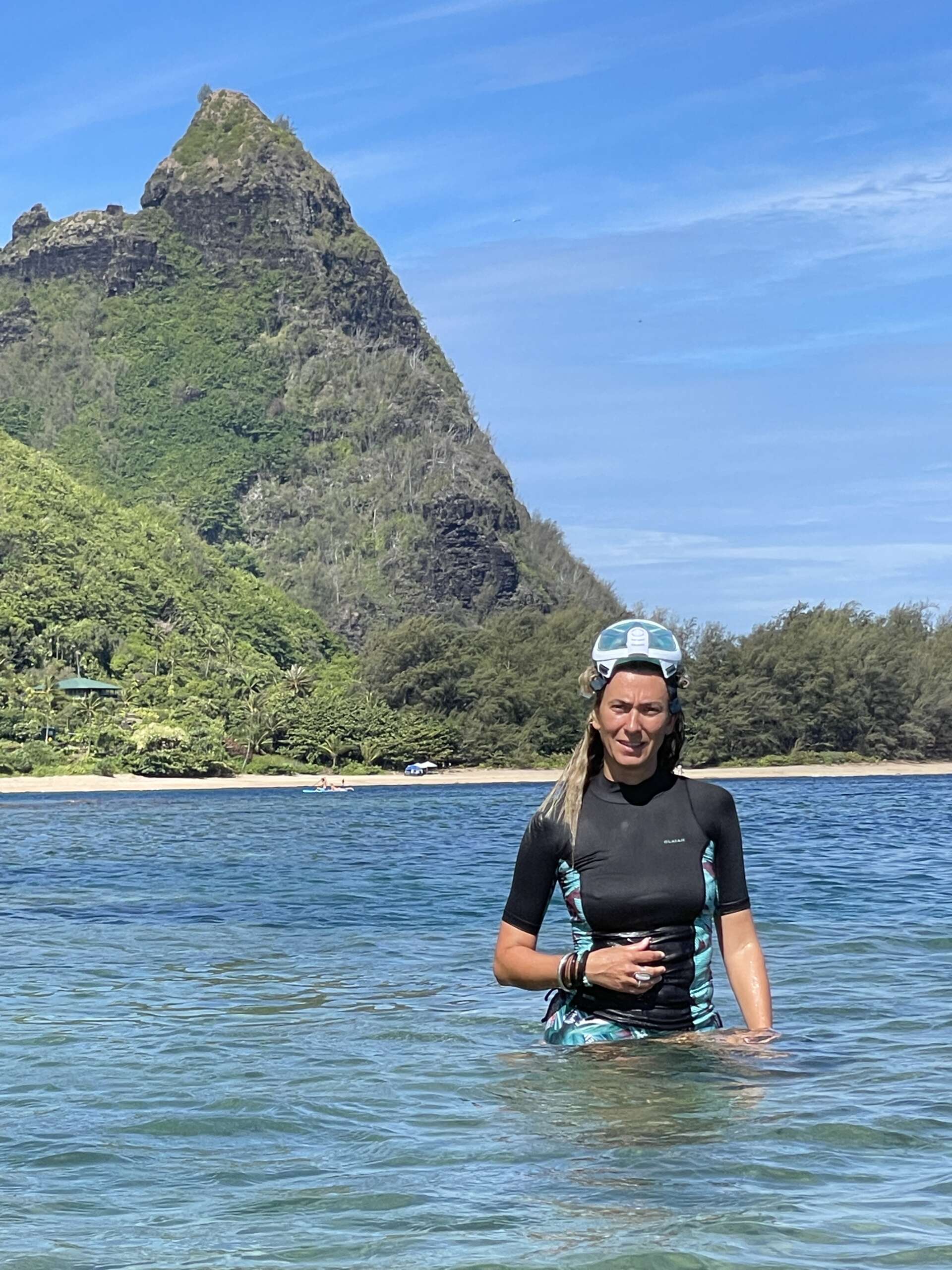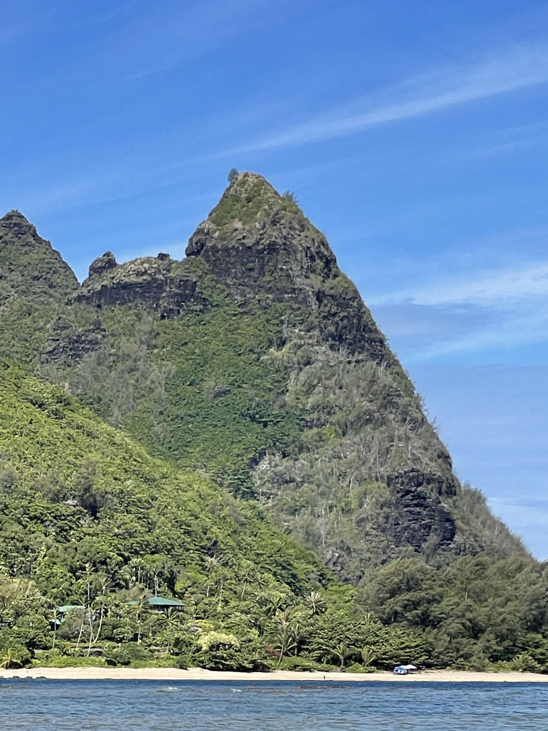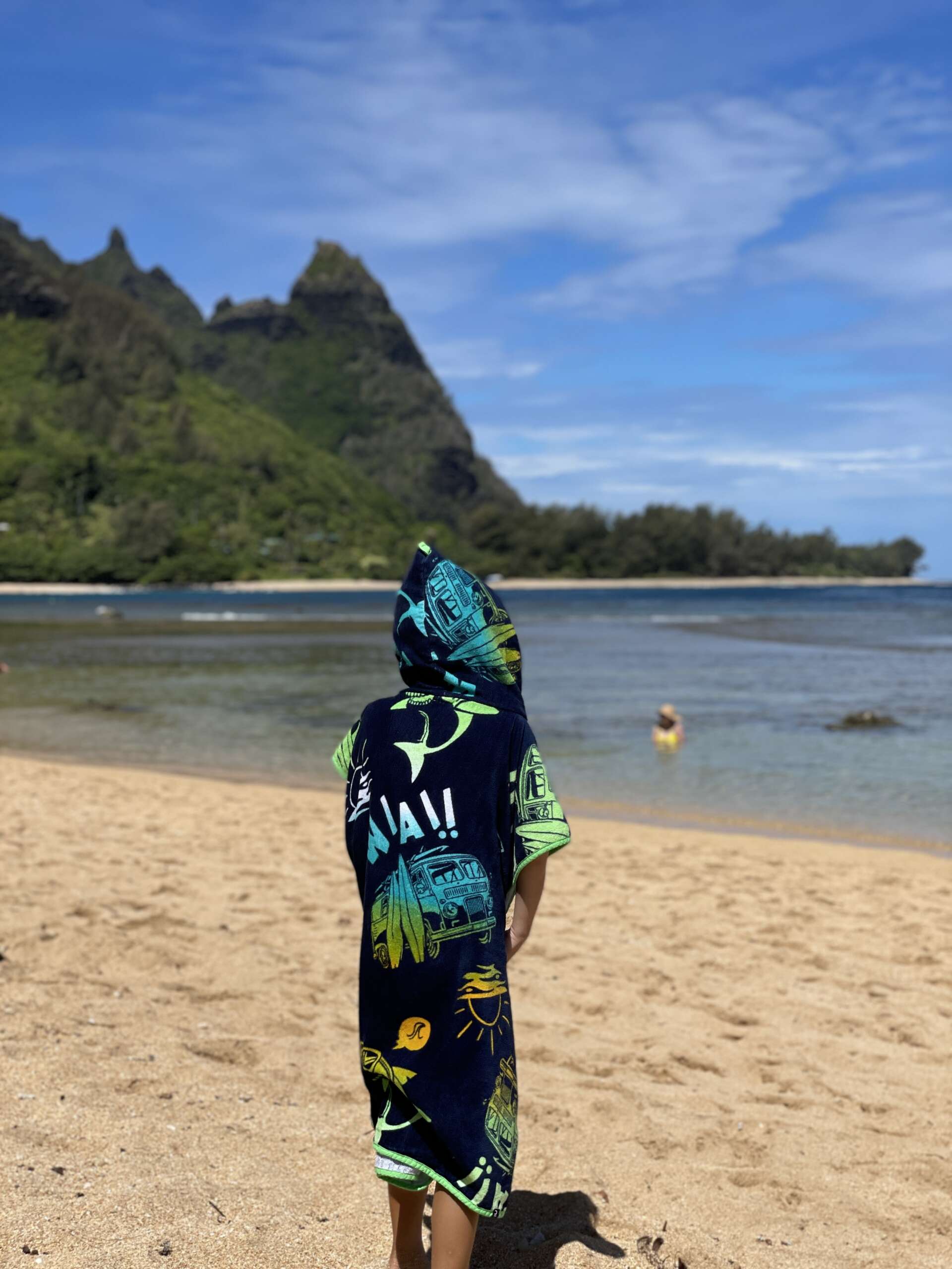 On s’installe sous des pins, la plage est en effet très sympa. Vue magistrale sur les ridges de la Napali coast qui débute à quelques kilomètres de là. L’eau est crystalline. Un petit passage permet de se faufiler entre des bancs de sable pour aller faire du snorkeling. C’est l’occasion de permettre Noah de se refamiliariser avec cet exercice qu’il avait fait à Fernando de Noronha pour le jour de ses 4 ans et où il avait nagé avec des tortues et un requin.