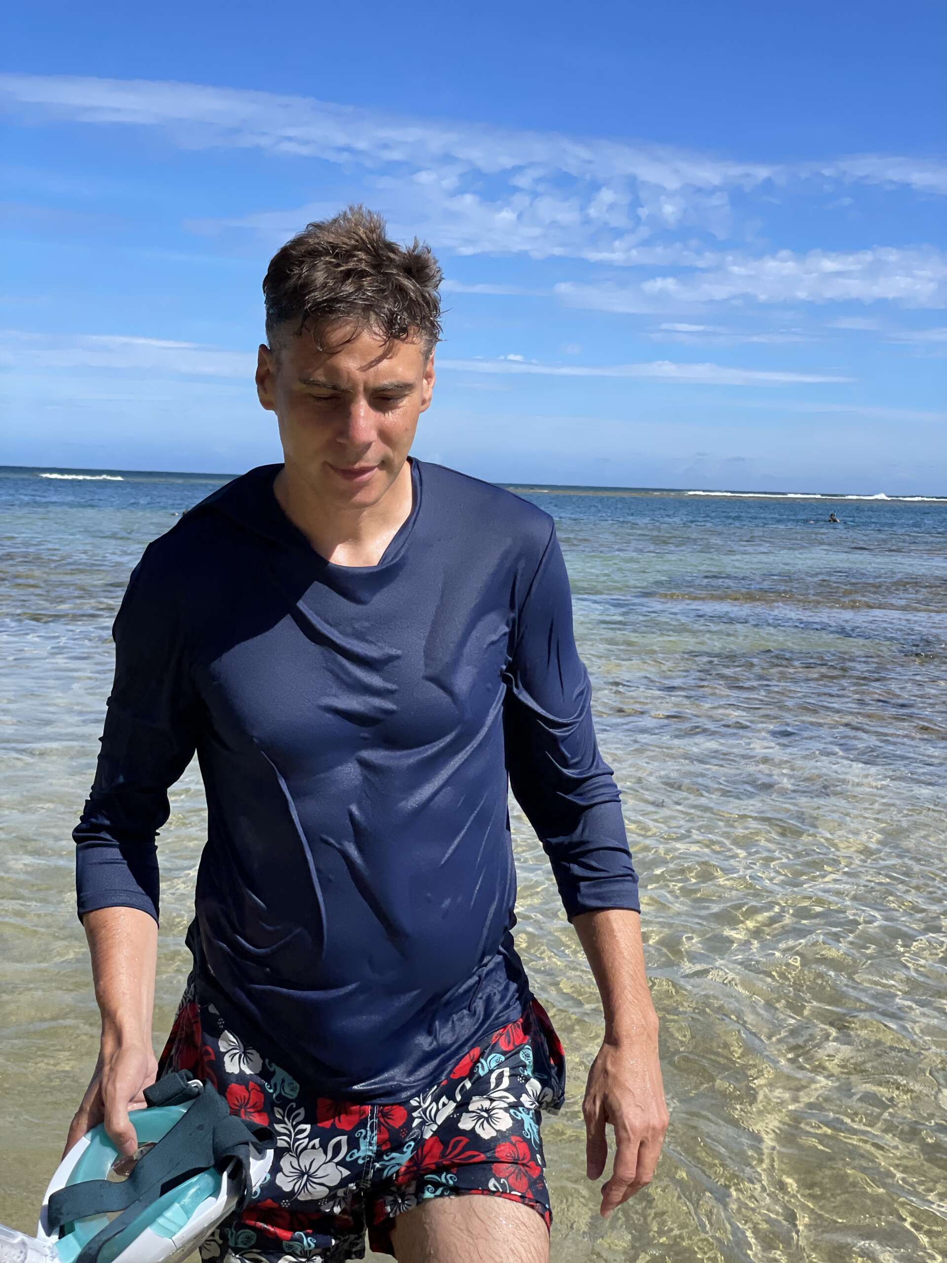 Il s’accroche à moi, continue à dire qu’il a froid et puis tout d’un coup je lui mets son masque et en 30 secondes il voit un poisson et se barre en nous mettant 3 mètres dans la vue à tel point que pendant 20 minutes il va aller de poissons en poissons en ne sortant la tête de l’eau que pour partager son enthousiasme.