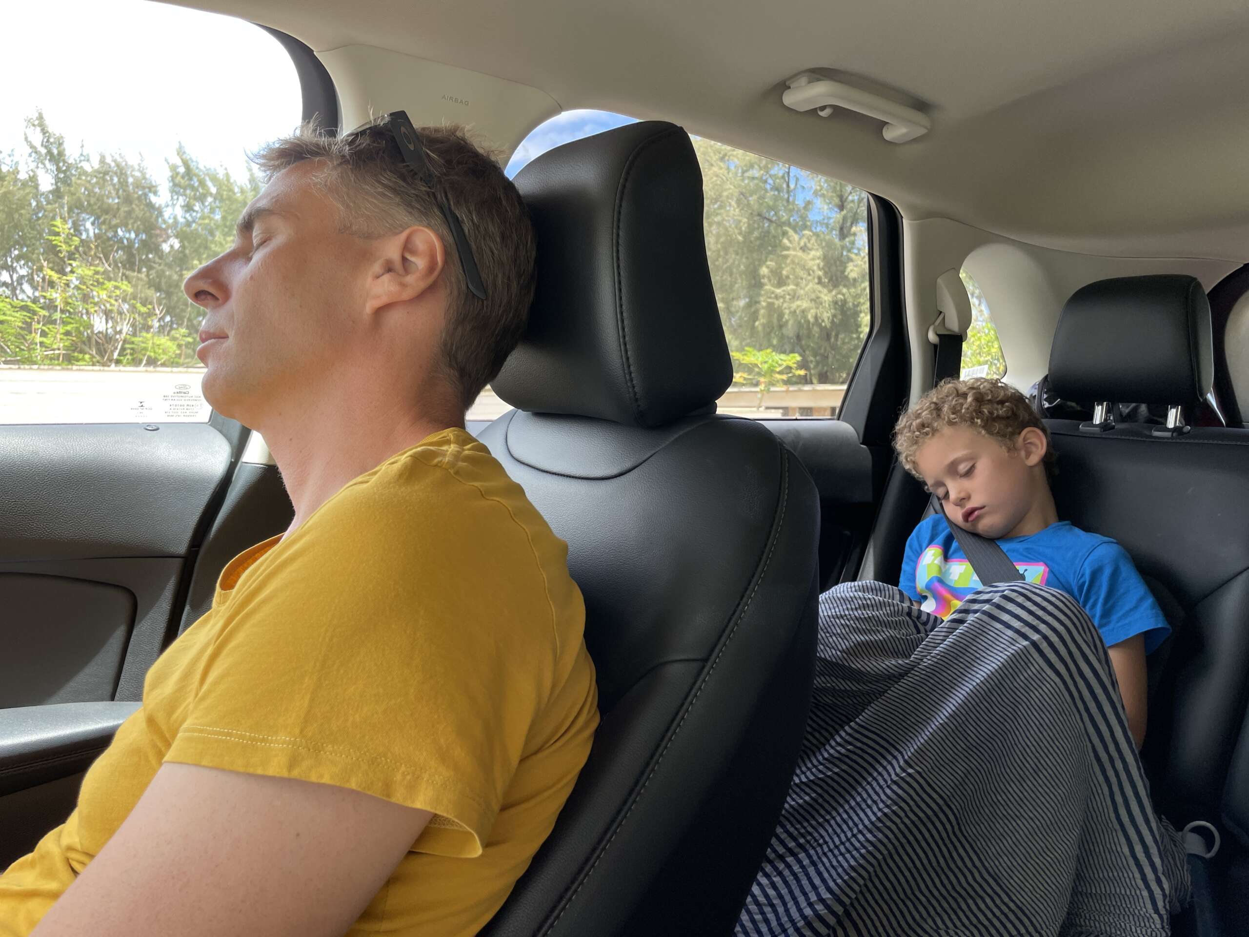 Il va se réveiller à la sortie de l’avion après avoir écrasé de la patate pour la deuxième fois de la journée. On repart louer notre voiture chez Budget. Temps au guichet, 40 secondes. C’est mieux que les 1h45 de la dernière fois. Mais la voiture n’est pas propre et ça, on va l’attendre 25 minutes avec un Noah en perdition qui a de plus en plus mal au ventre et mal à la tête et qui s’endort cette fois dans mes bras.