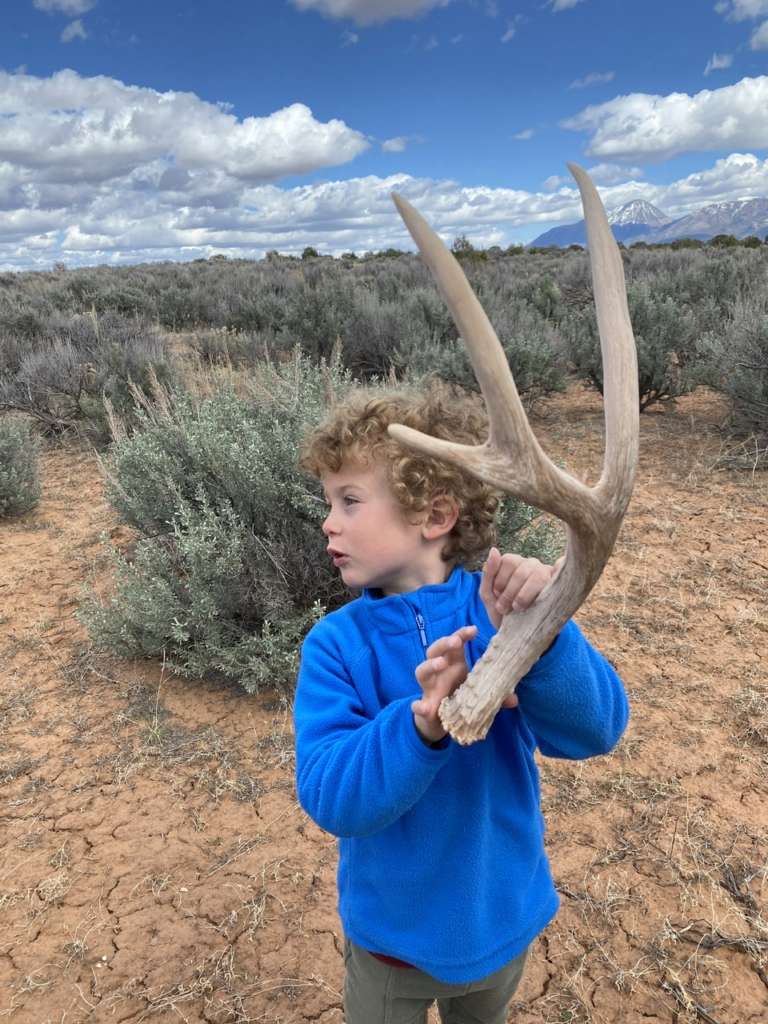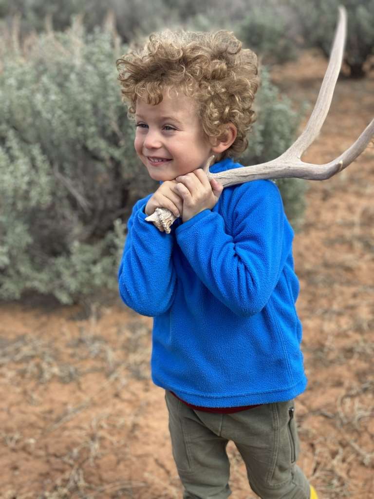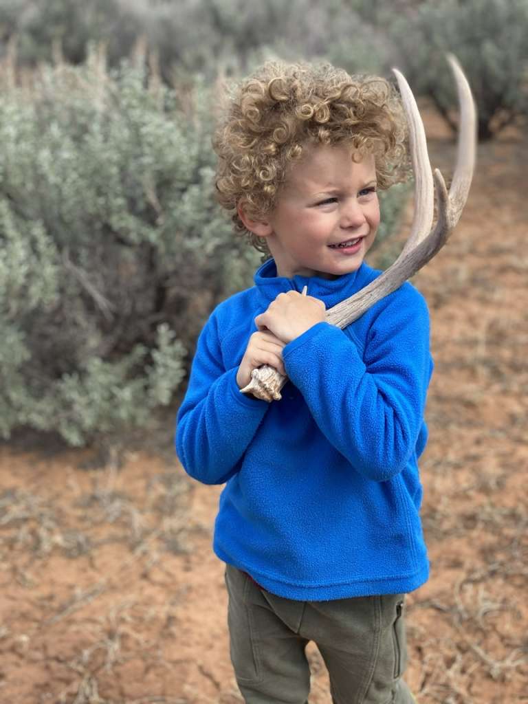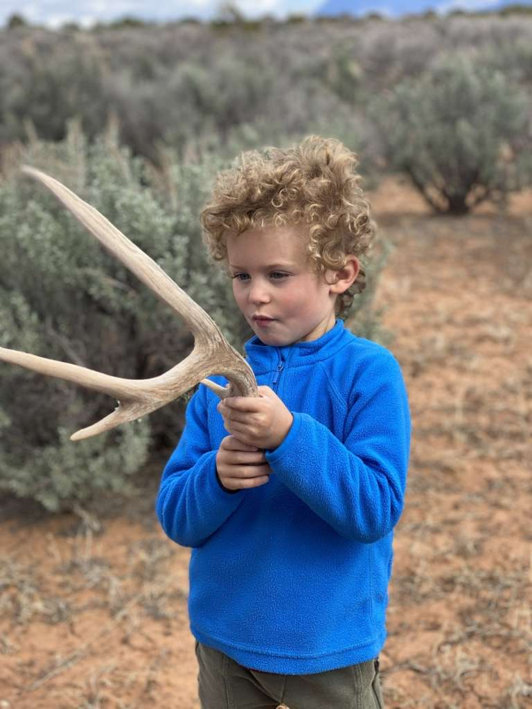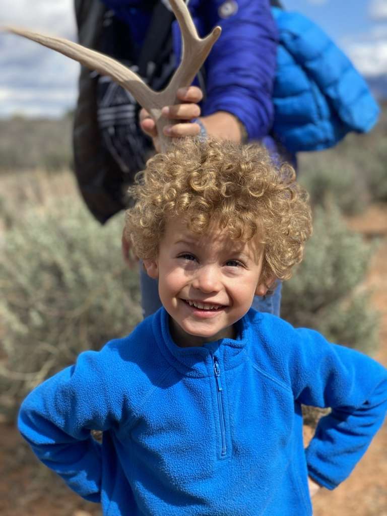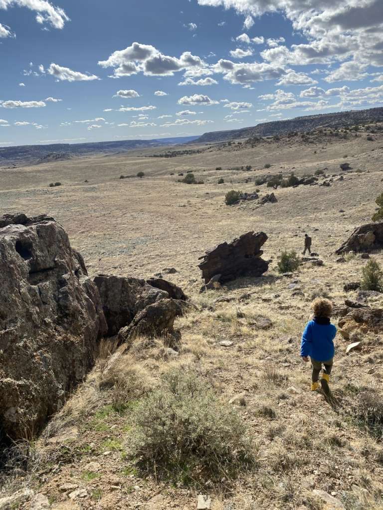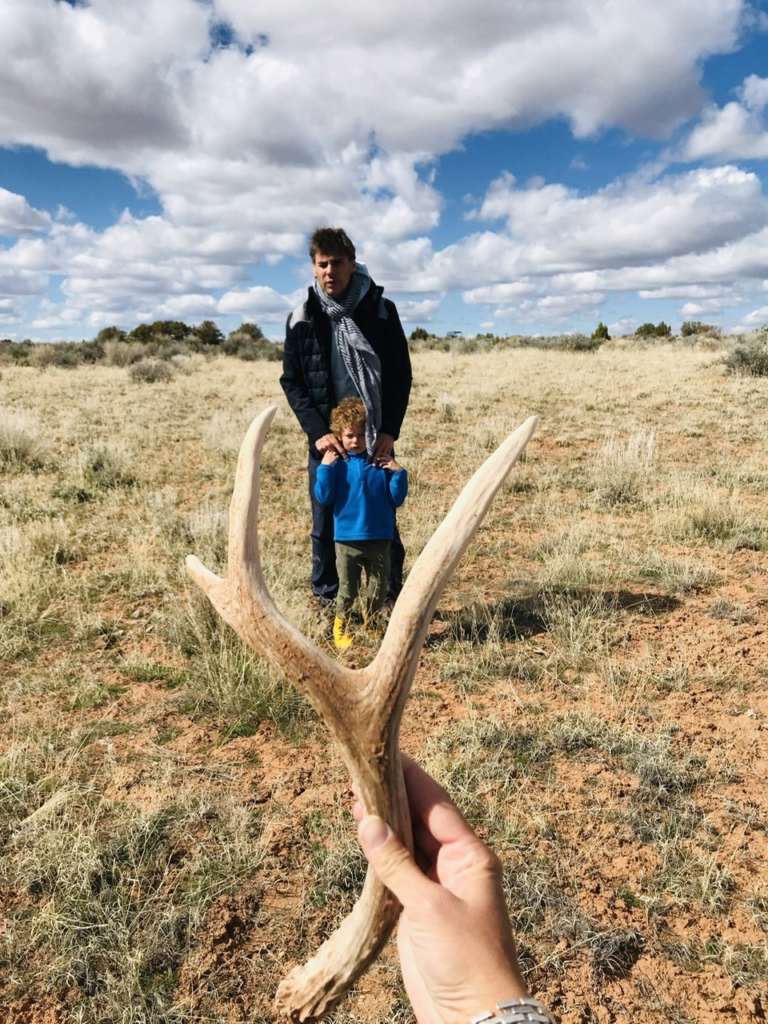 On reprend la voiture et on rebrousse chemin pour s’arrêter un peu plus loin pour marcher sur une plaine qui doit déboucher sur un beau point de vue. Noah raloche. Il est fatigué (pas de sieste il faut dire), donc il fait sa guimauve en mimant la personne épuisée ce qui a le don de nous taper sur les nerfs avec Virginie. Petit regain d’énergie passager lorsque Virginie lui déniche des bois de cerfs et qu’on lui fait miroiter la perspective de voir des chevaux sauvages -qu’on ne verra pas -, mais au bout d’un moment, il finit dans mes bras vu qu’on n’a pas pris de porte bébé. Outch.