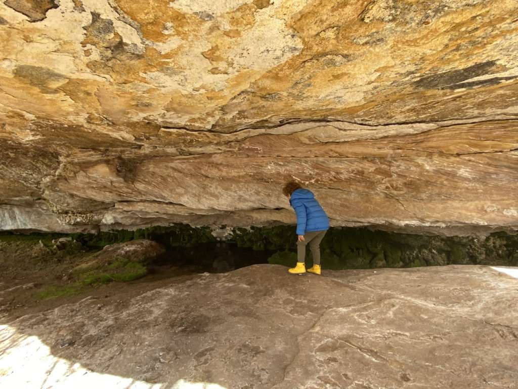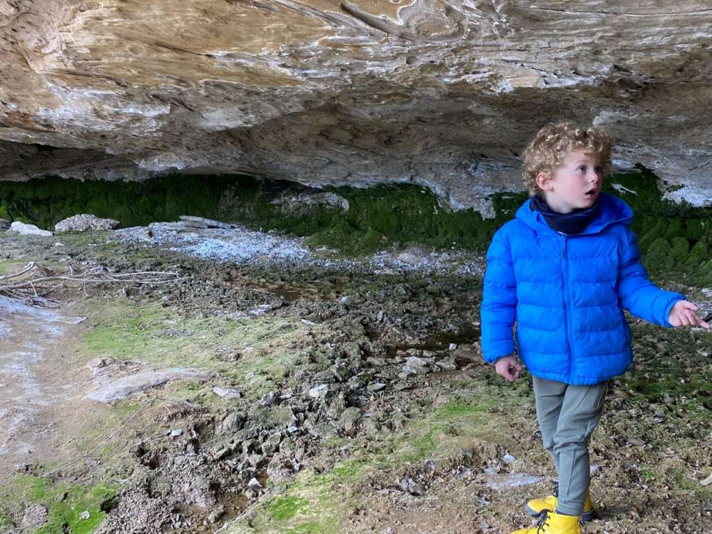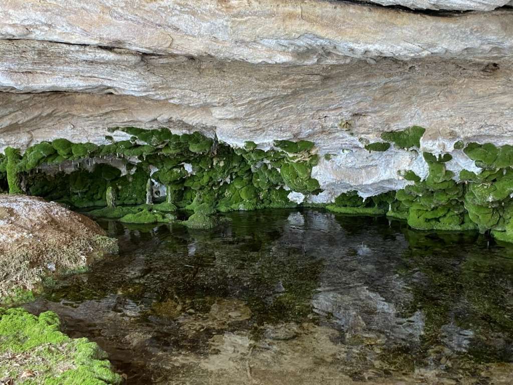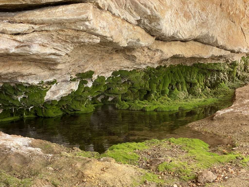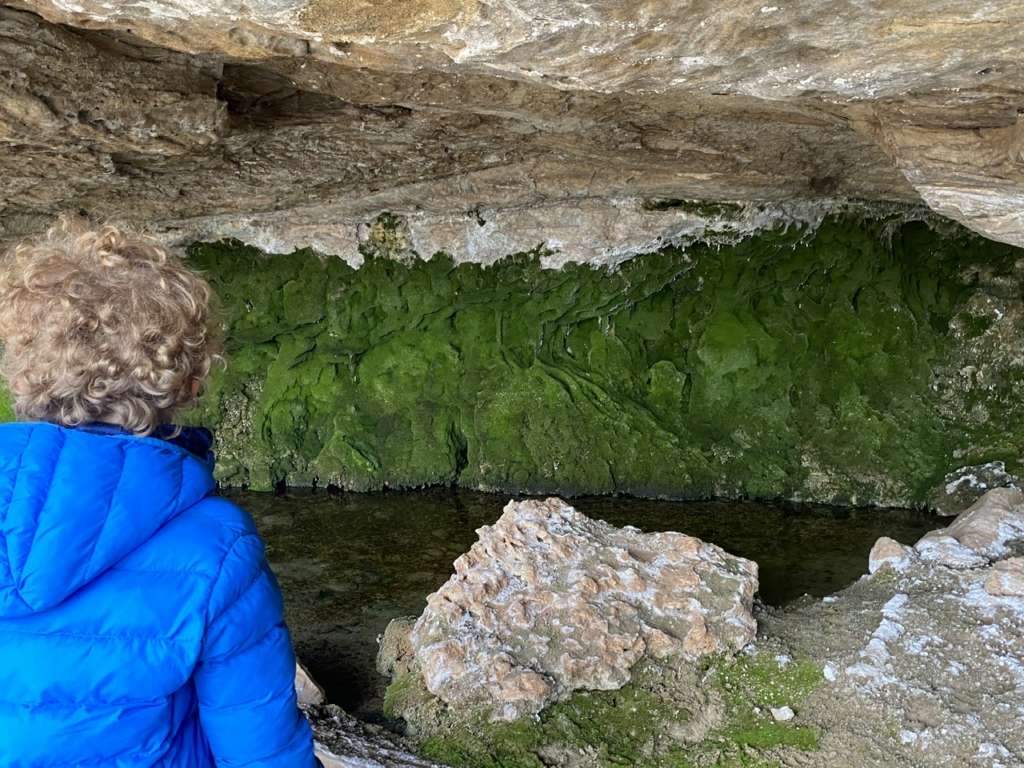 Puis, on descend dans le canyon par une petite ouverture dans la roche pour atteindre 2 petites grottes qui abritent les 2 sources d’eau de pluie qui ont cette caractéristique rarissime dans cette région aride de fournir de l’eau toute l’année. L’eau ruisselle de la roche en goutte à goutte et forme un petit point d’eau au milieu de la grotte. Pas étonnant que ce lieu ait été jalousement gardé. Noah qui adore les grottes est d’autant plus à l’aise dedans qu’il est le seul à pouvoir presque se tenir debout à l’intérieur. Il se met en quête de pièces d’or mais ne reste pas insensible à la beauté du lieu et notamment aux mousses vert tendre qui s’y sont développées. Il nous lache sont fameux « c’est vraiment magnifique ».