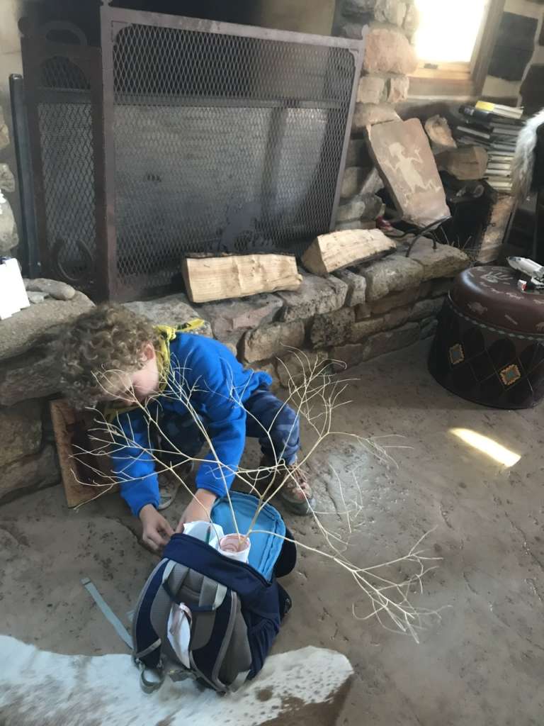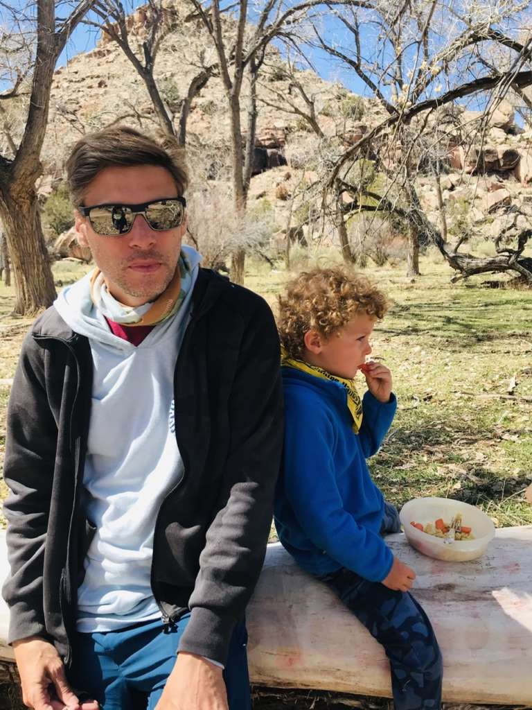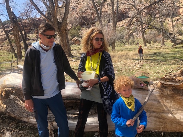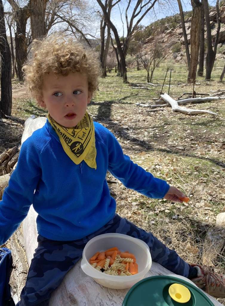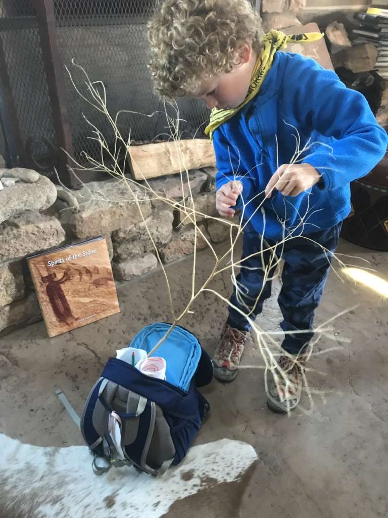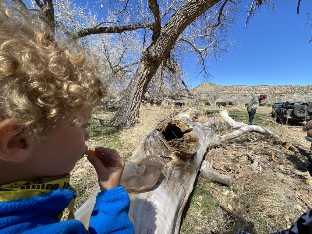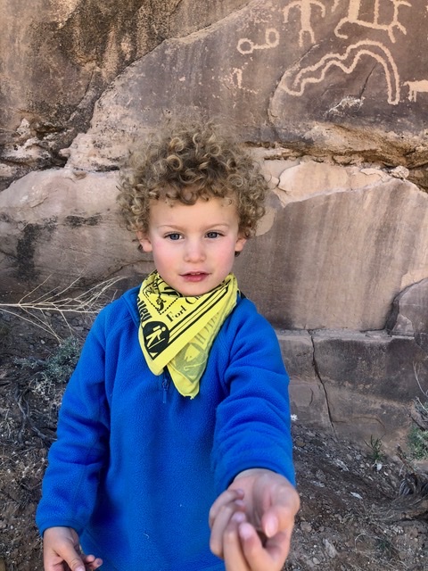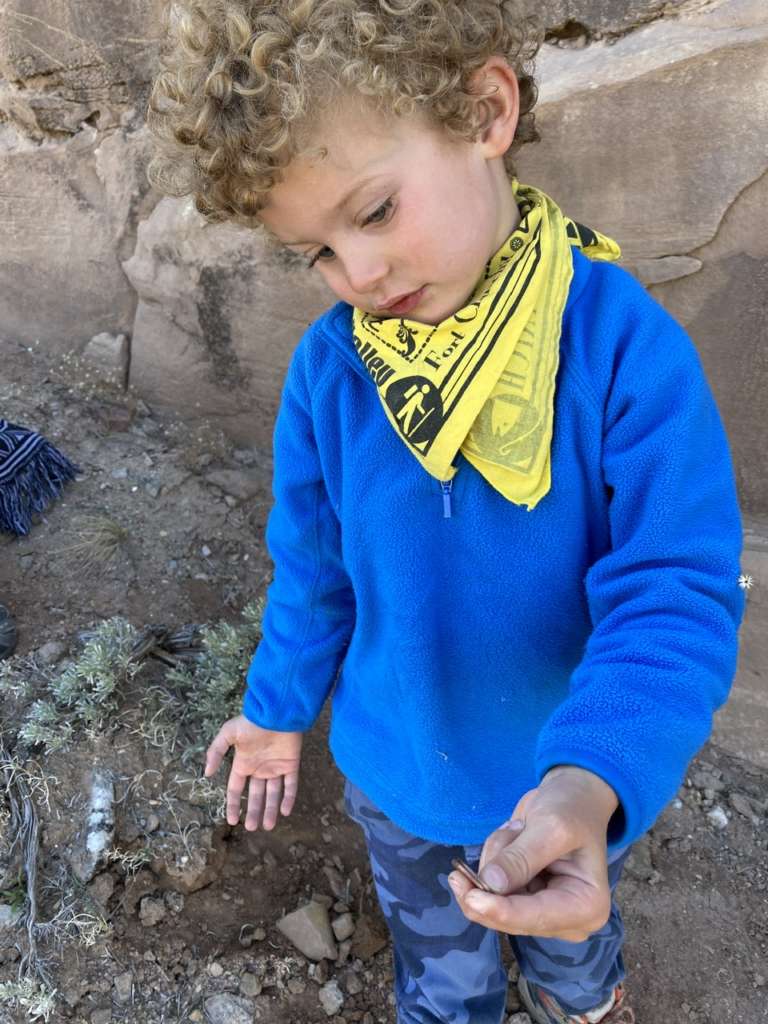 Il se retourne pour regarder à nouveau les pétroglyphes et me dit « regarde, il y a d’autres pièces ». Mince, je n’avais pas vu, mais en effet sur le côté il y a 2 autres ronds dessinés. Heureusement qu’il me reste quelques pièces dans ma poche. J’en profite pour en cacher 2 de plus sous un petit monticule pendant qu’il regarde ailleurs et l’invite à chercher les autres pièces. Il se remet à creuser de ses petites mains et fini par les trouver. Pas peu fier de trouver cette fois 2 pièces d’or. Il se dirige vers Garry et lui en donne une. Il faut dire que la veille, quand Garry parlait du trésor caché de Butch Cassidy, il avait dit à Noah que Noah pouvait chercher le trésor mais que s’il le trouvait, il faudrait en donner la moitié à Garry. Voilà c’est chose faite. Noah a donné une des 2 pièces qu’il a trouvé. Garry est très impressionné qu’il s’en soit rappelé et Noah a découvert la division par deux.