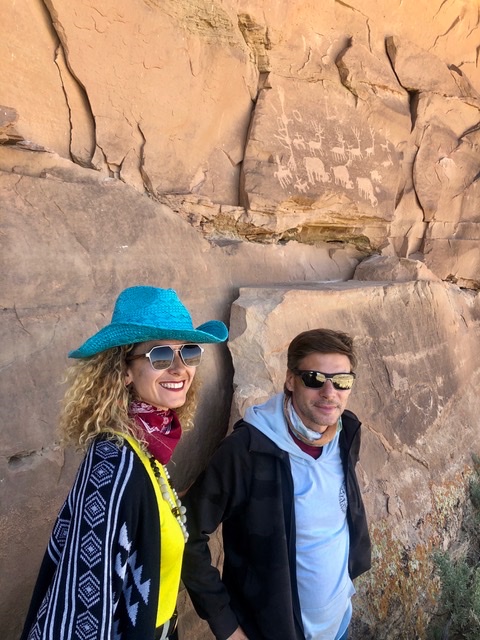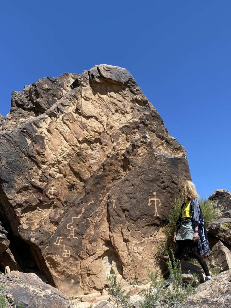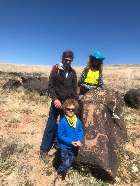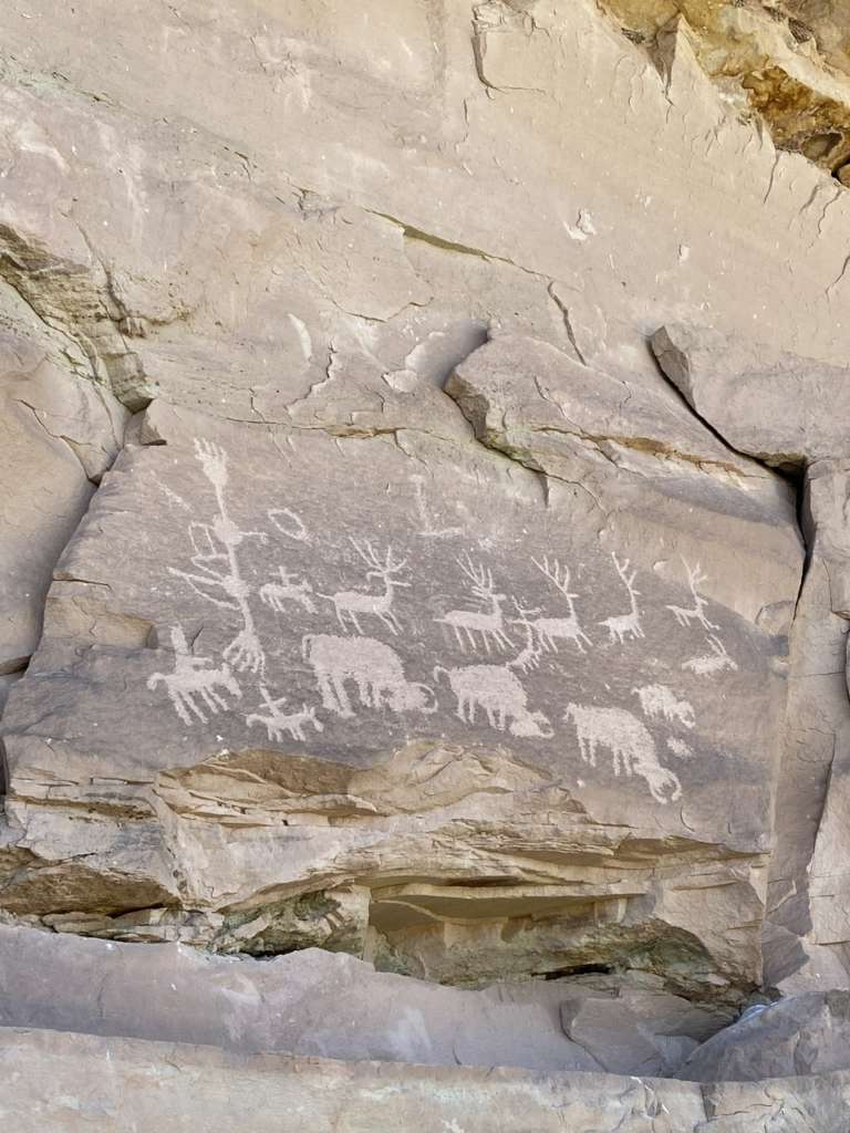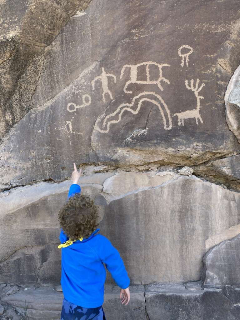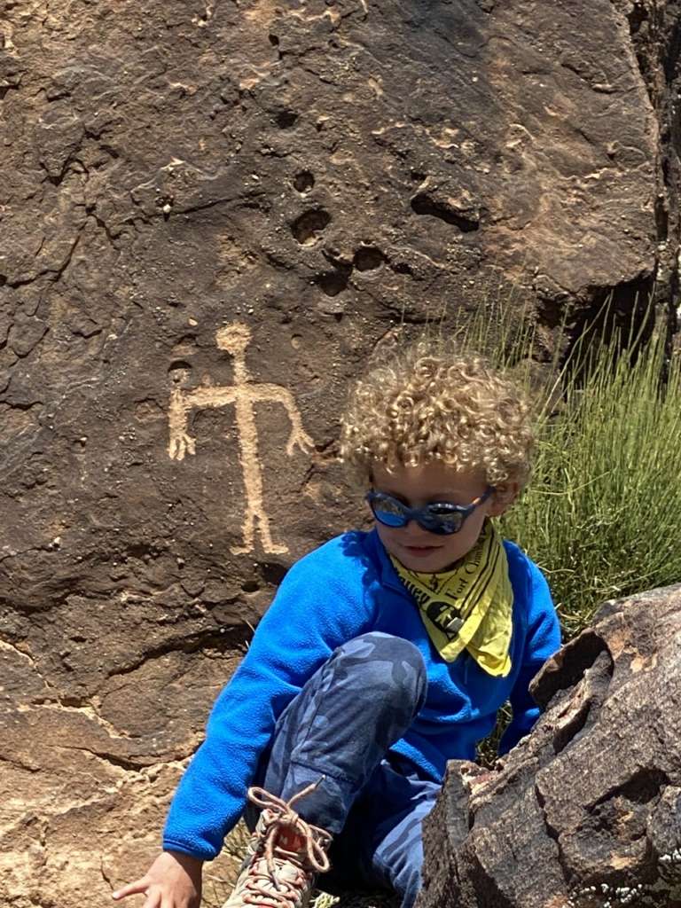 Je reprends le cours chronologique de notre histoire. On s’arrête dans un canyon beaucoup plus verdoyant, et pour cause, car au milieu coule une rivière. On se met à nouveau sur le bas côté et on se met à escalader l’une des parois du canyon pour voir d’autres pétroglyphes. Noah au début préfère rester dans la voiture à jouer avec les autres enfants qui ne veulent pas monter, puis au bout d’un moment se décide à nous rejoindre vers le premier pan de mur où de nombreux animaux ont été dessinés.