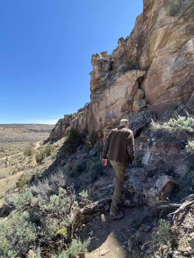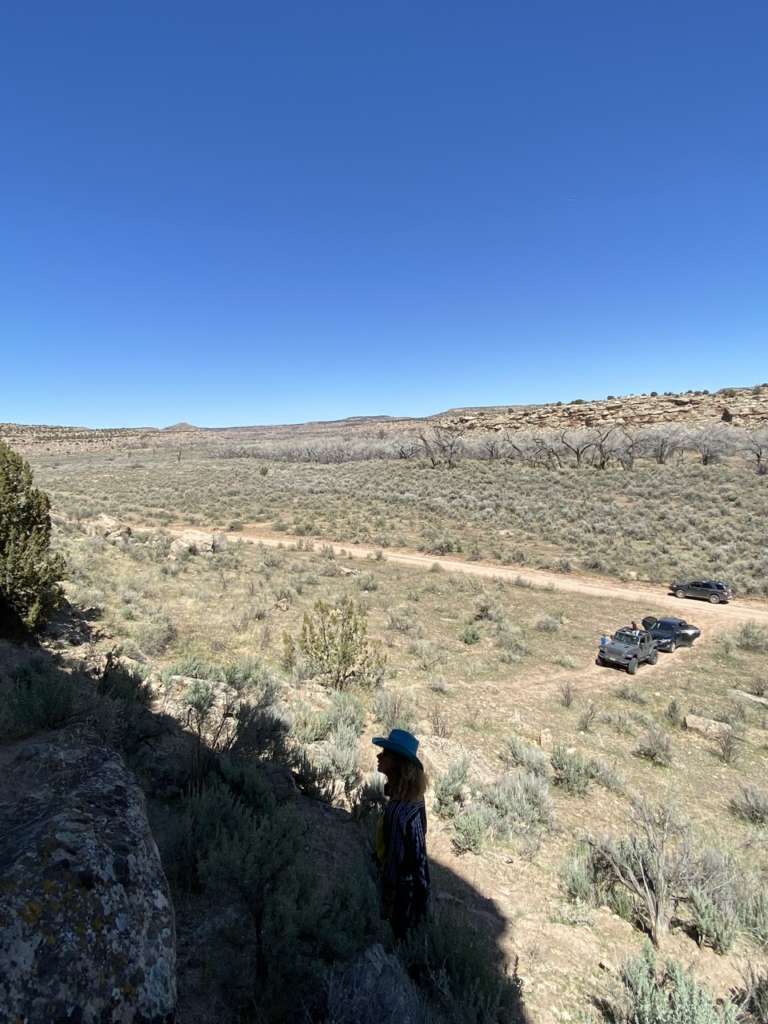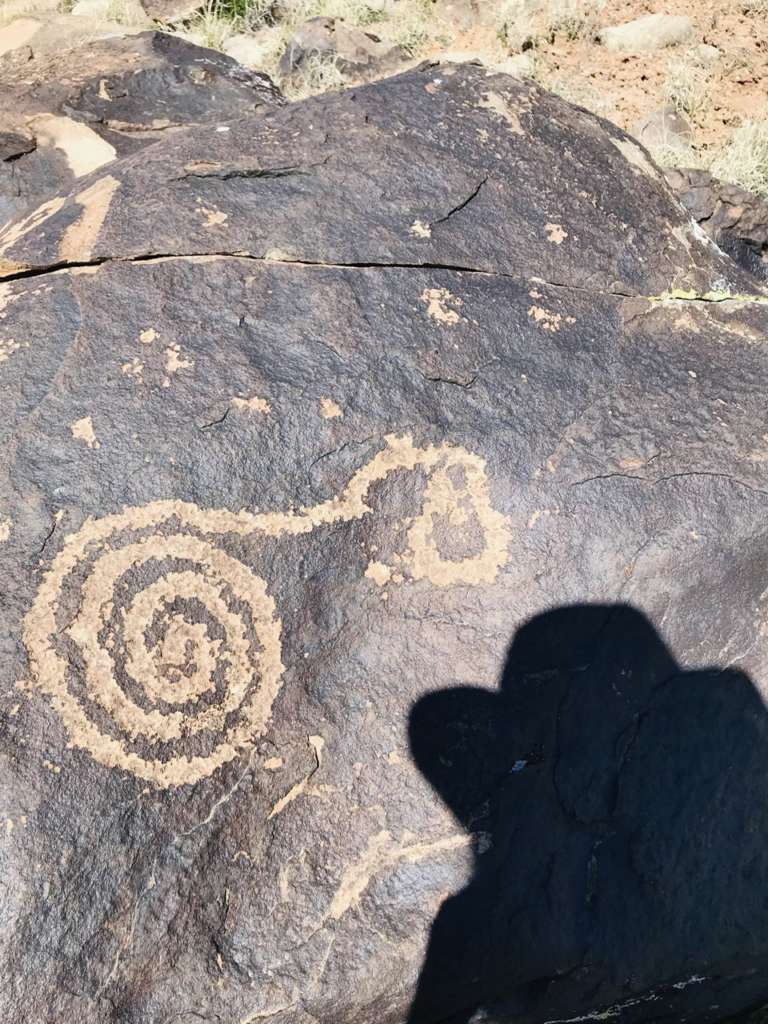 Ici, rien d’indiqué, ce sont des terres appartenant à l’état, donc on s’arrête sur le bas côté et on fait une courte marche en traçant notre chemin vers une hauteur où Garry y a trouvé il y a quelques années un rocher avec de jolis pétroglyphes.