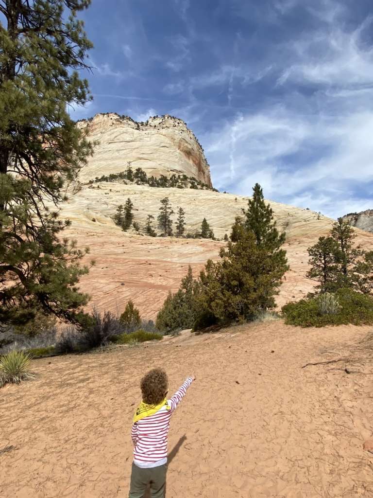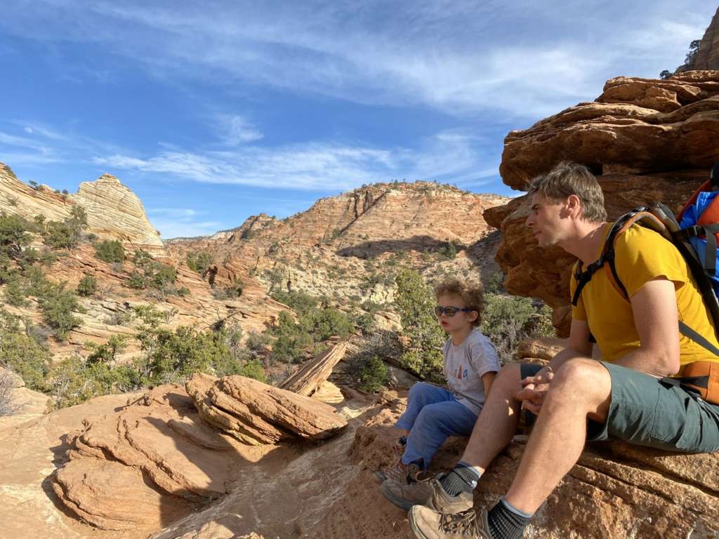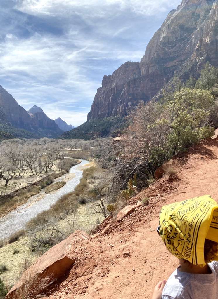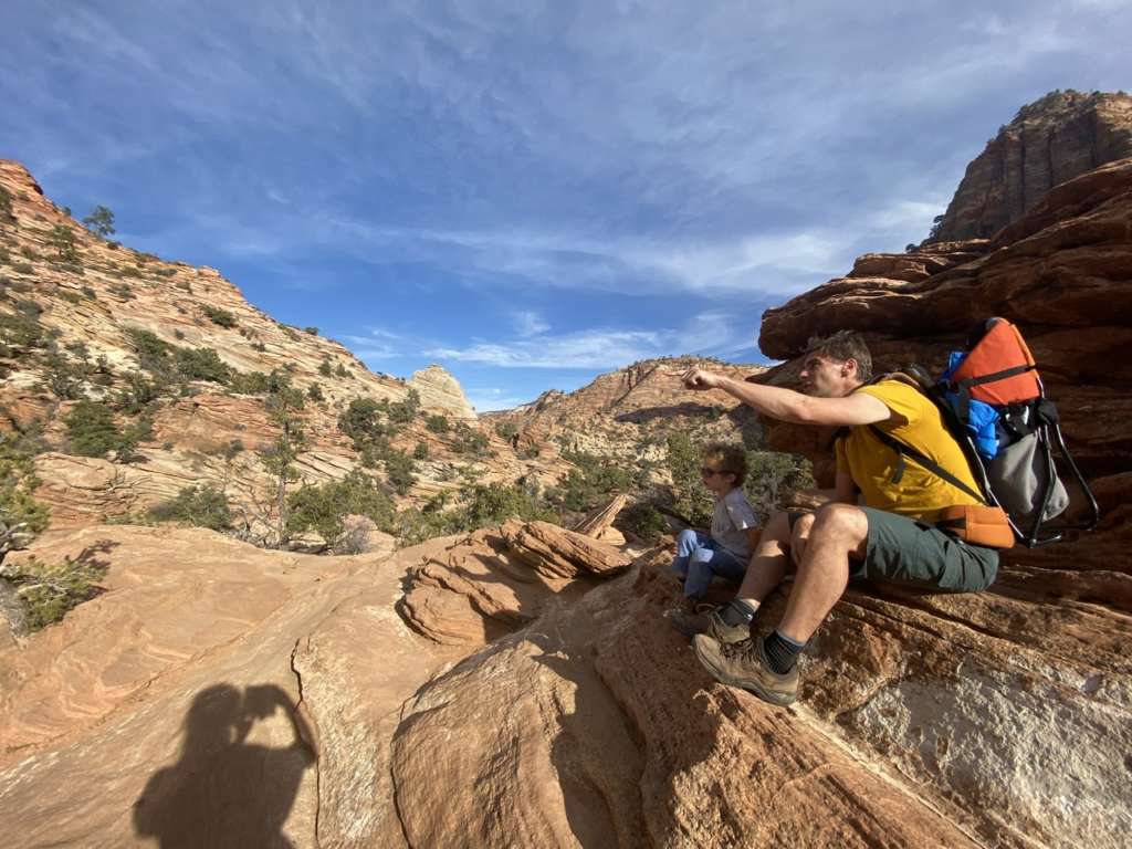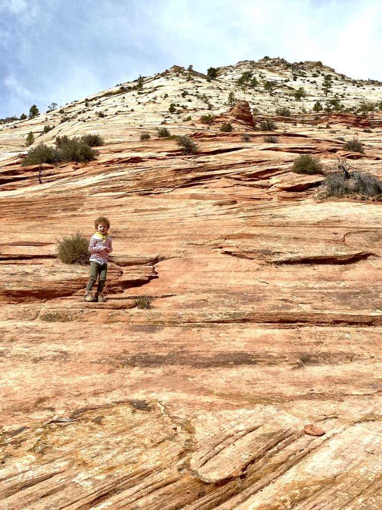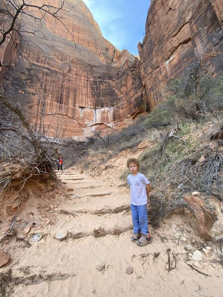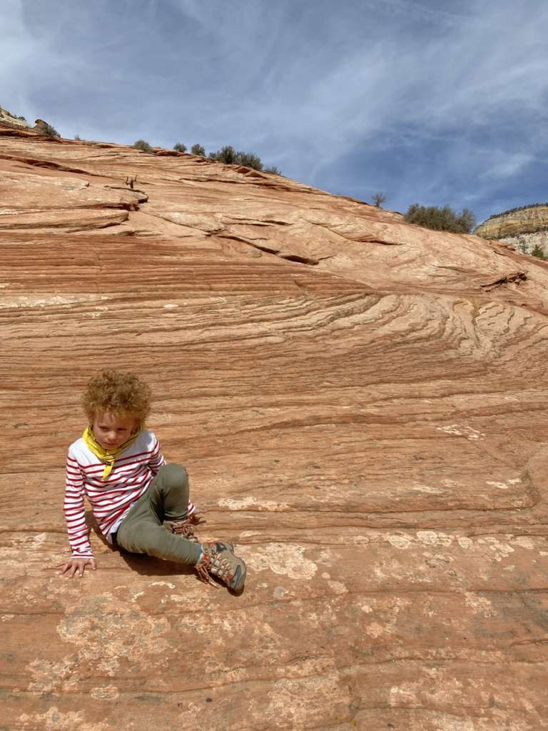 Zion a la particularité d’être un des rares canyons qui se visite de dessous et où les randos montent pour avoir des points de vue. Les parois étant particulièrement abruptes, ca monte sec, voir très sec, et certaines randos nécessitent de s’encorder ou de monter en s’appuyant sur des chaînes. Du coup, avec doudou, on remise celles-ci à une prochaine visite, en espérant que la prochaine fois le problème pour les faire ne soit pas notre grand âge.
