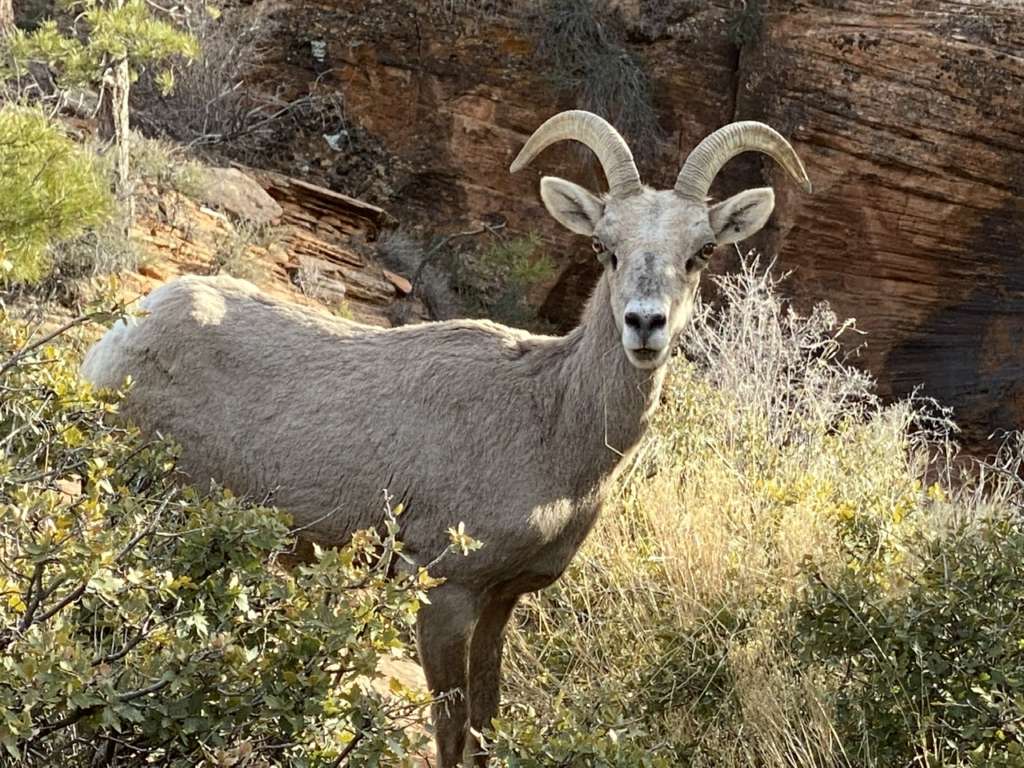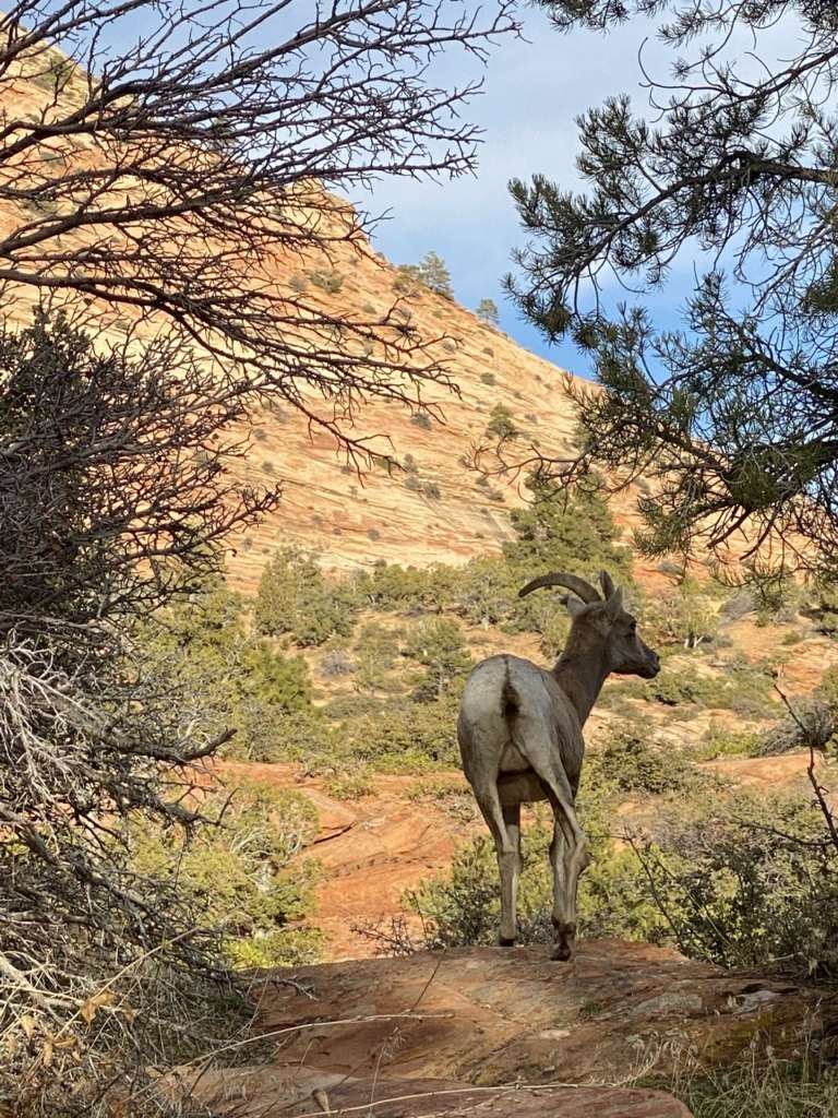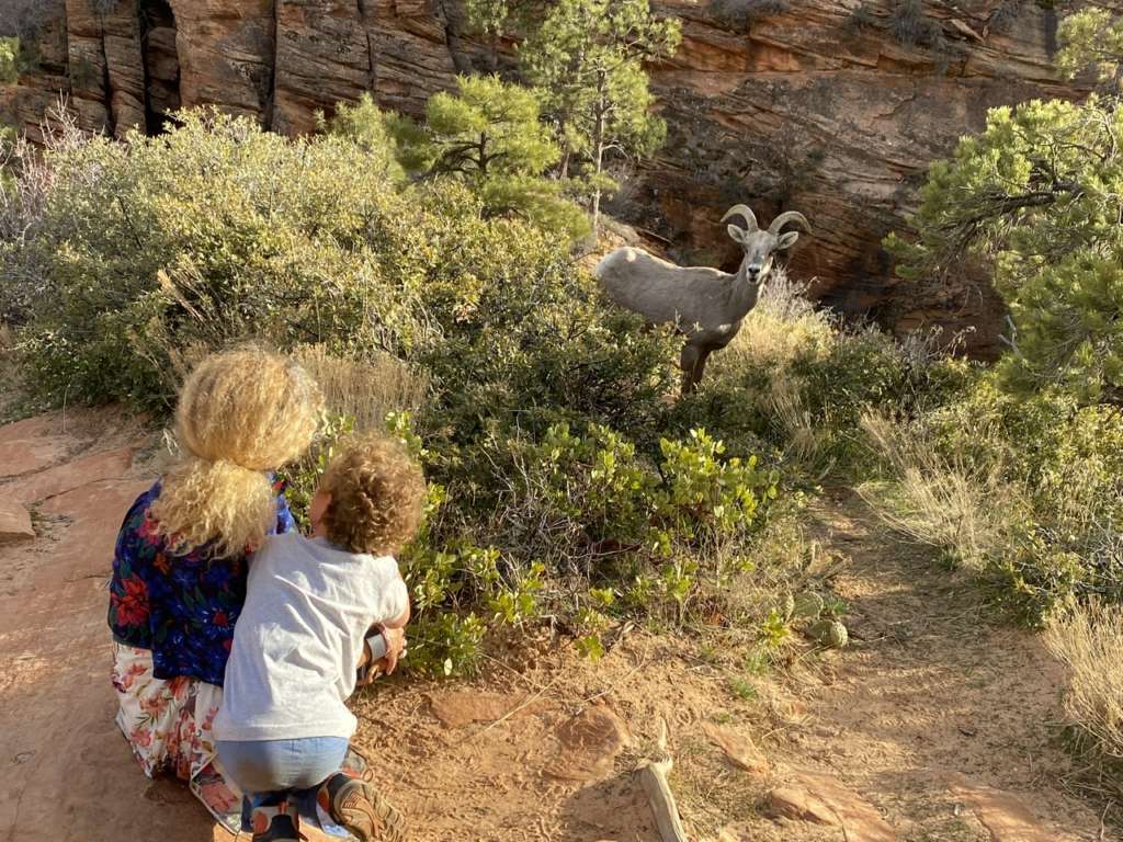 Seul avantage, avec Noah sur le dos on redescend plus vite, et là on se dit qu’on va enfin rentrer à l’hôtel avant 19h d’une de nos journées. Sauf que voila, sur le retour on s’arrête juste deux minutes pour prendre une photo d’une falaise éclairée par le soleil couchant. Juste à côté, un mouflon sort sa tête. Tout le monde veut aller voir, et nous voila partis à pas de loups (car Noah sait le faire quand il veut) pour petit à petit réduire la distance avec le mouflon et pouvoir s’approcher de lui à quelques mètres. On en voit ensuite un second, un troisième.. ; un gars avec un téléobjectif intrigue Noah qui va le voir et le gars, gentiment lui en montre d’autres, bref on y reste 30 minutes.