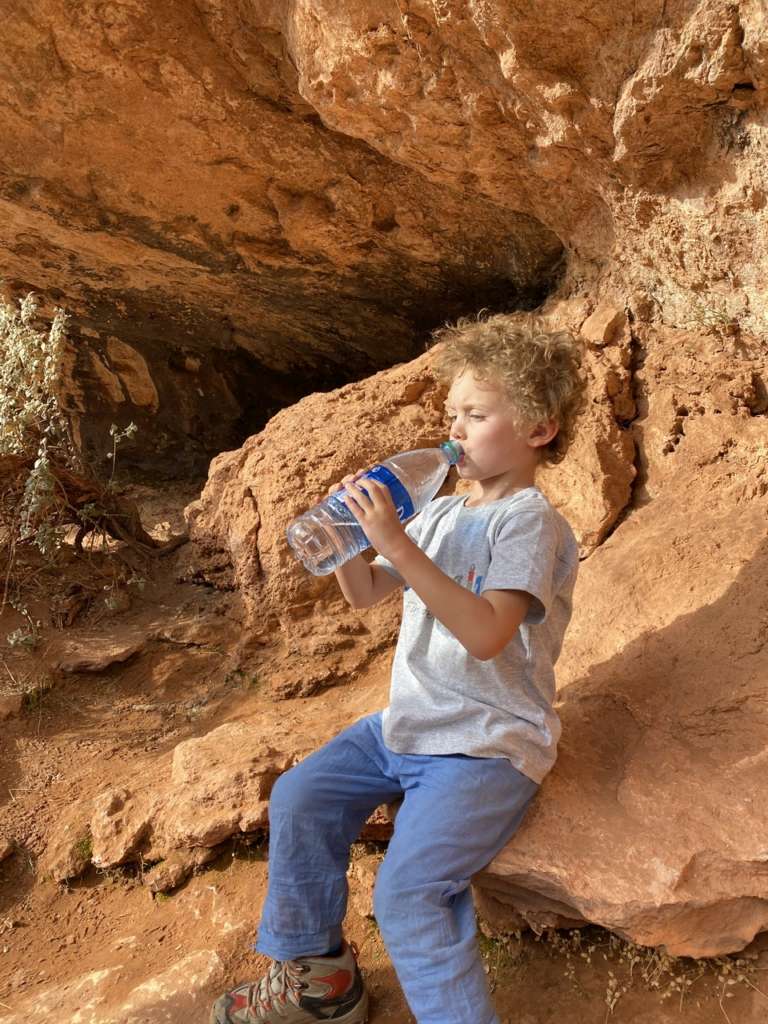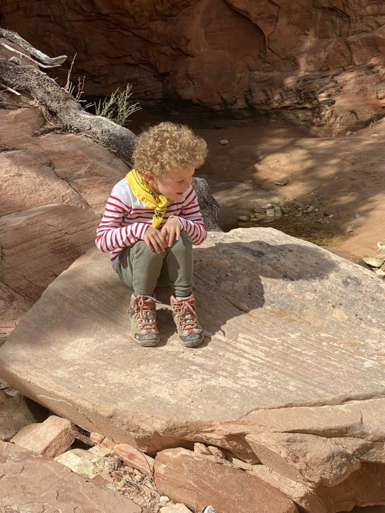 Noah monte hyper bien en observant les traditionnels Commandements du Bon Marcheur qu’on instauré. Du coup il monte tout seul à l’aller jusqu’à la petite mare créée par de l’eau de pluie et qui est plus marron que émeraude. Soit le gars qui a nommé cette ballade était daltonien, soit il a été un peu « over selling ». Après, la marche longe une des falaises et s’enfonce dans un replis du canyon, donc c’est vraiment une chouette ballade.