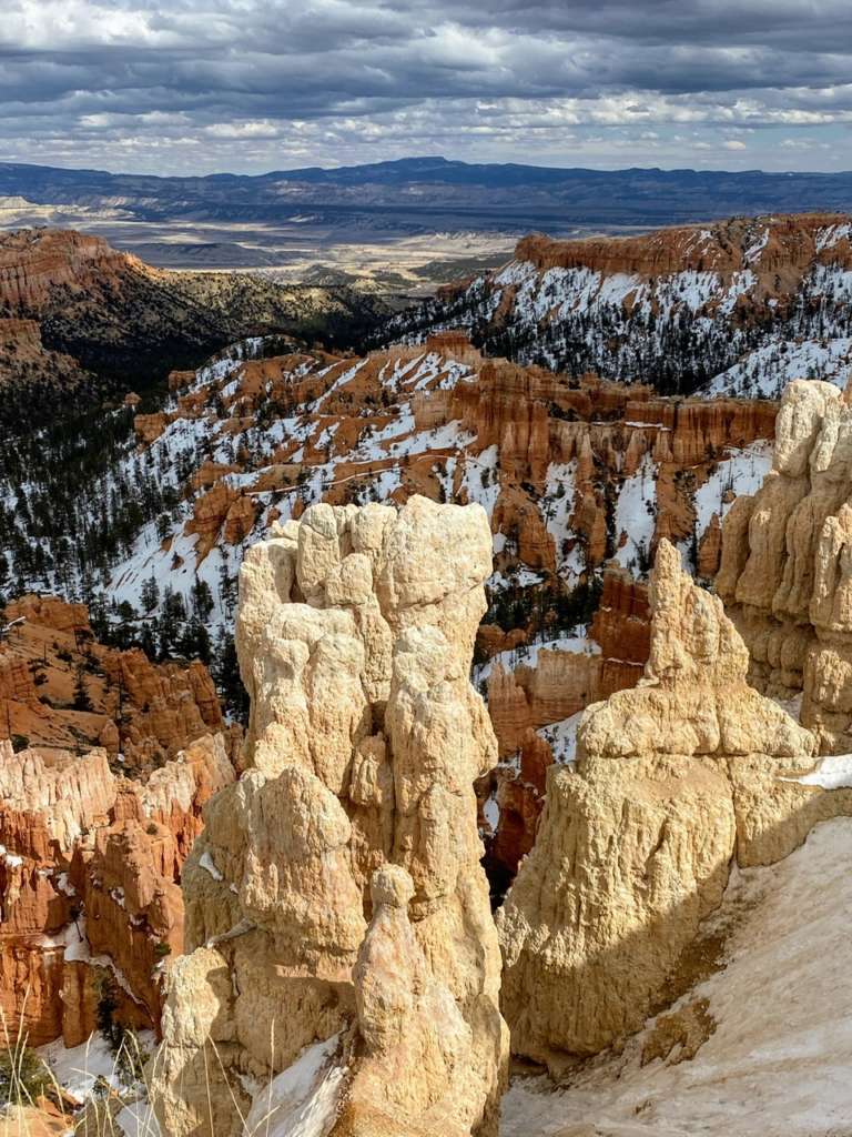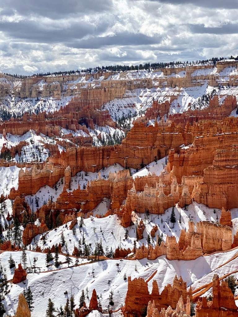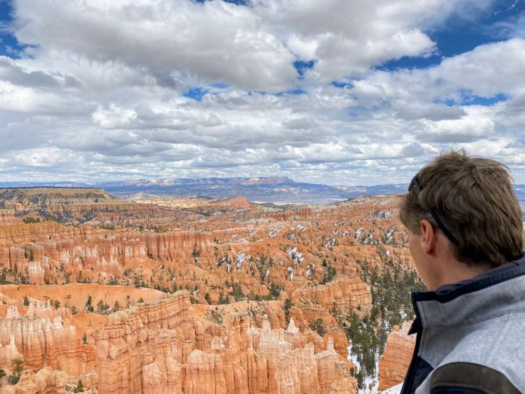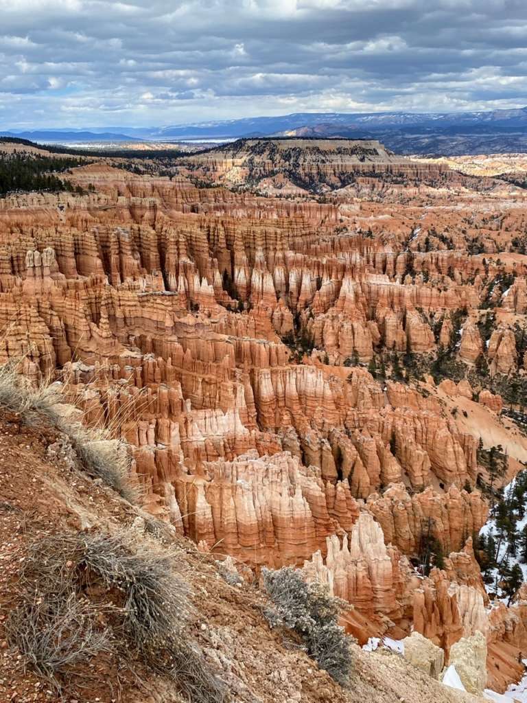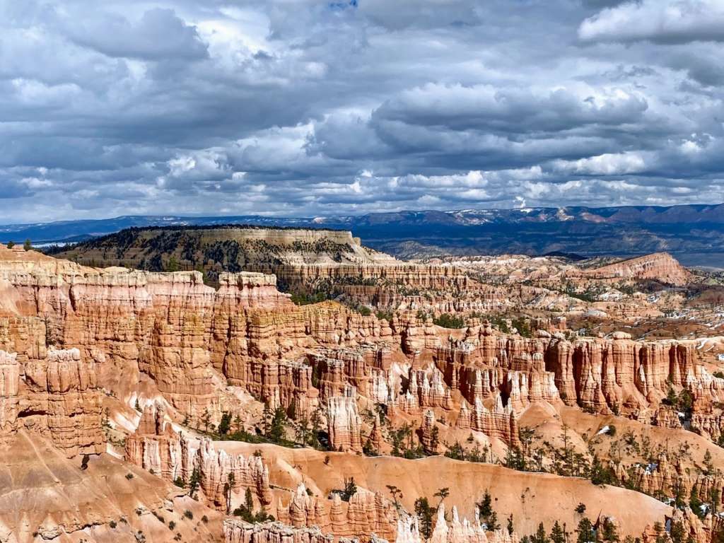 Direction ce matin Bryce Canyon à une bonne heure et demie de là. Première surprise, le temps est plutôt couvert. Et oui, on parle toujours des grands parcs sous un bleu azur et par 45 degrés à l’ombre, mais on est début mars, et début mars, le matin, tu te les pèles et visiblement il peut ne pas faire très beau.
