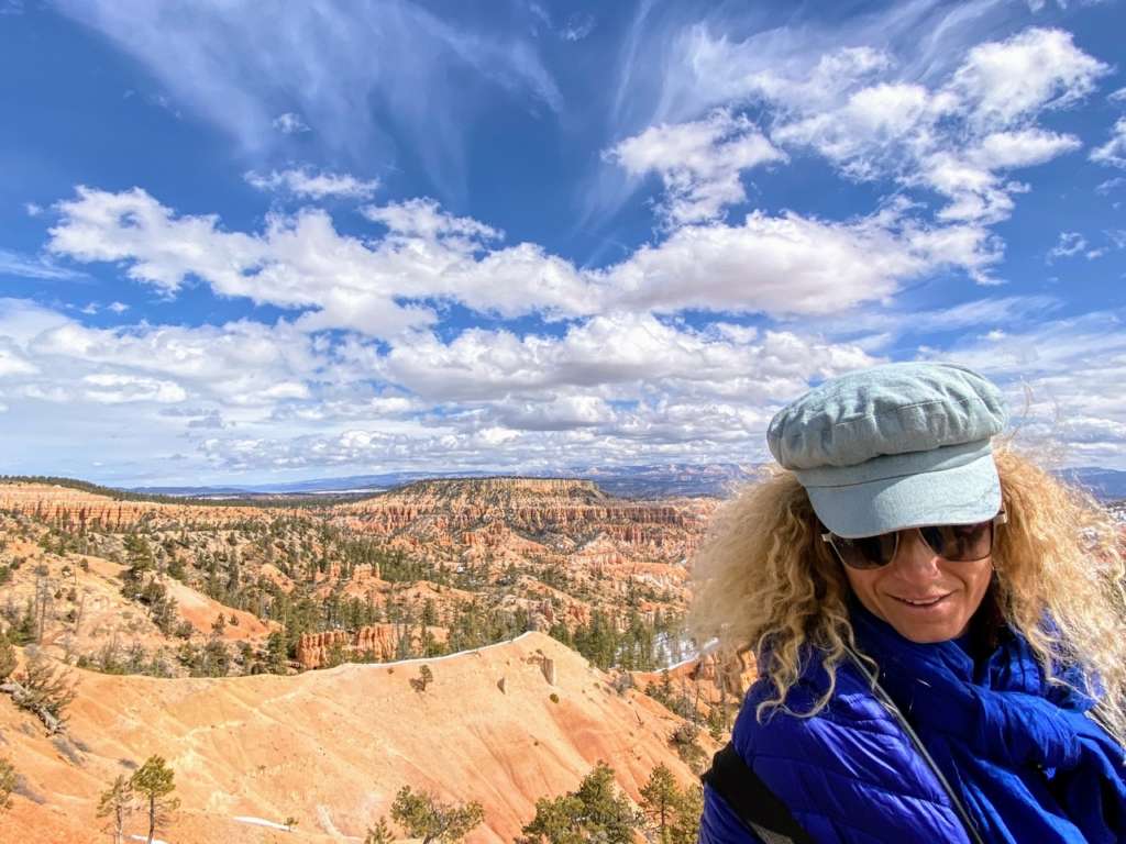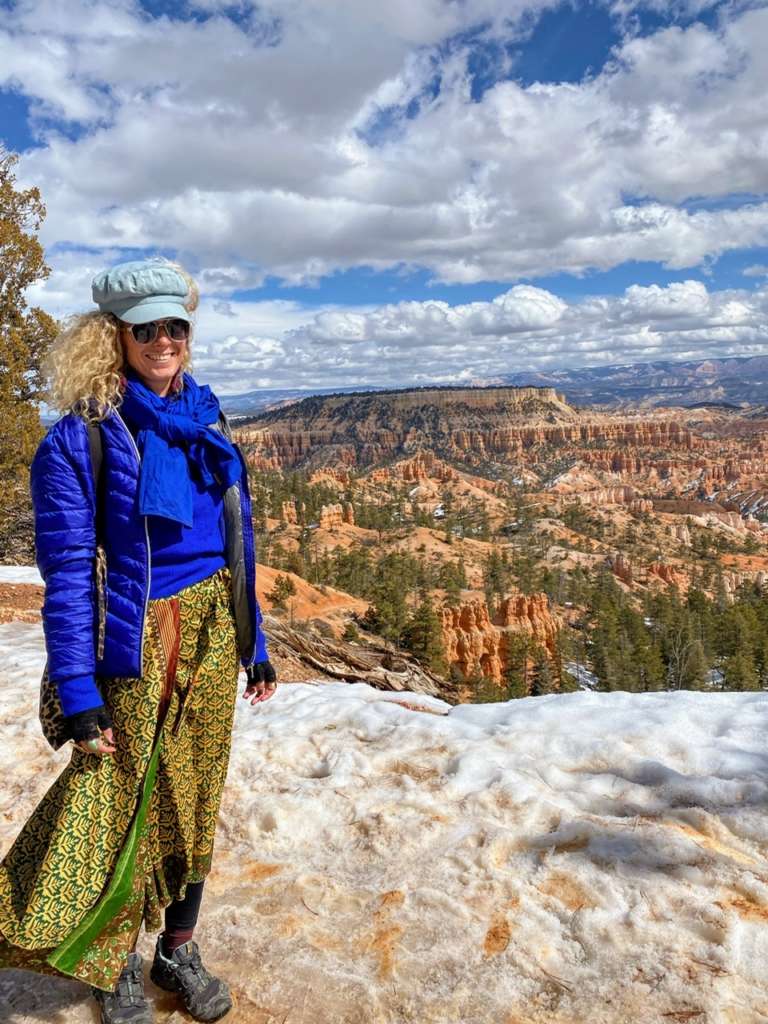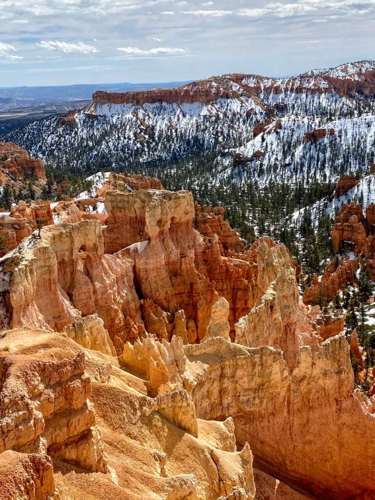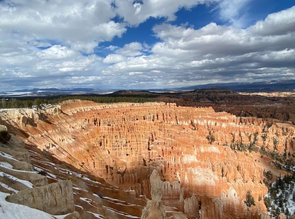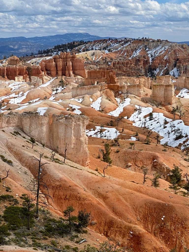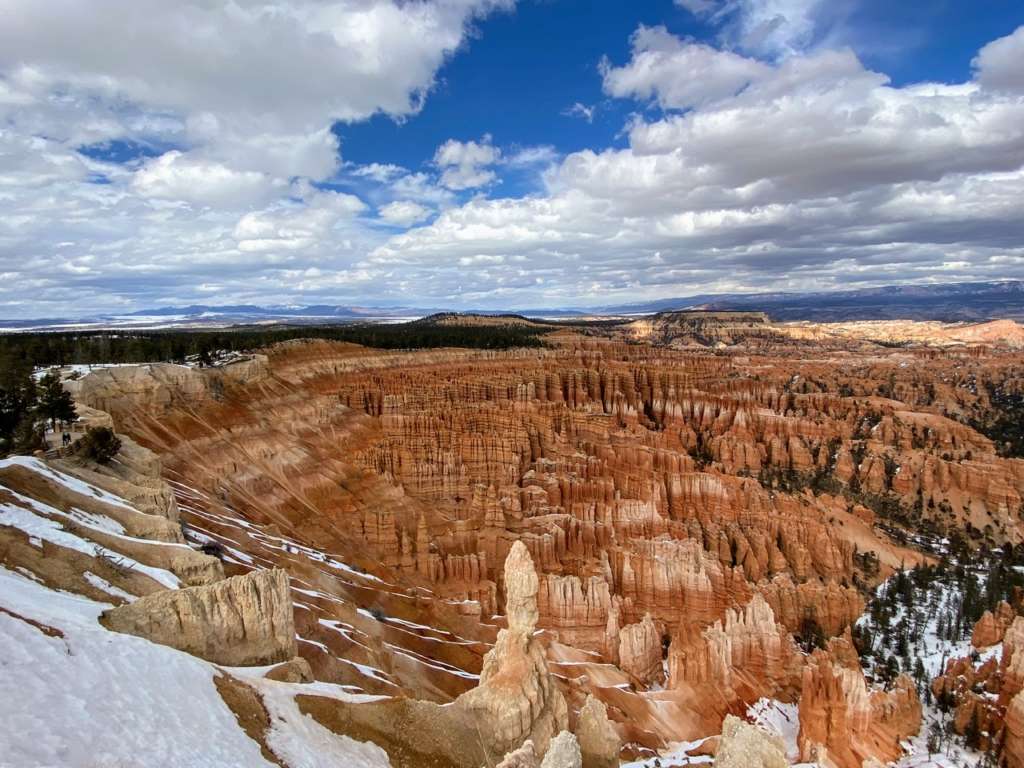 Direction ce matin Bryce Canyon à une bonne heure et demie de là. Première surprise, le temps est plutôt couvert. Et oui, on parle toujours des grands parcs sous un bleu azur et par 45 degrés à l’ombre, mais on est début mars, et début mars, le matin, tu te les pèles et visiblement il peut ne pas faire très beau.