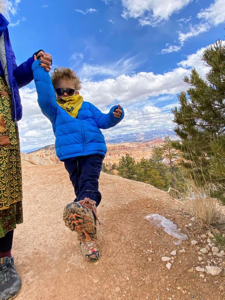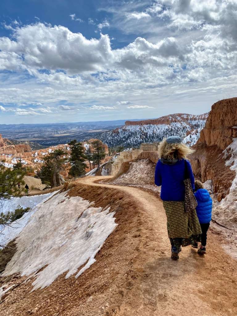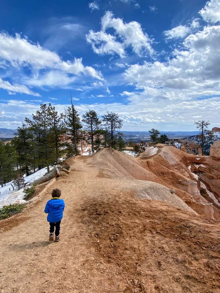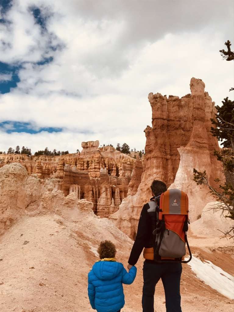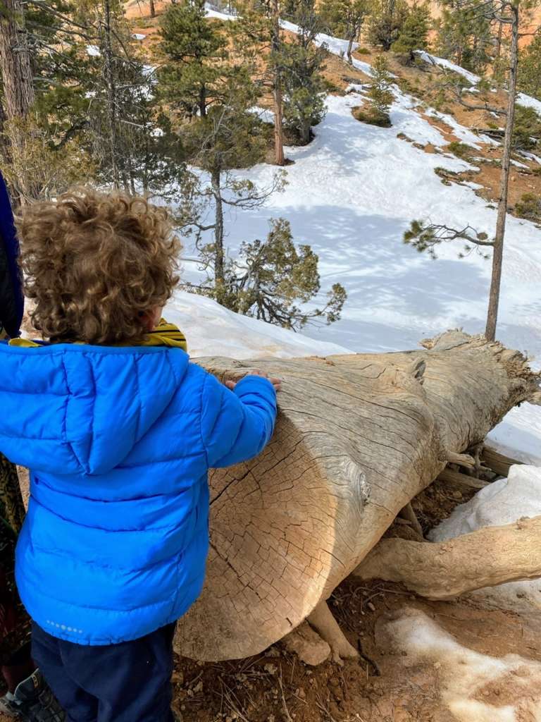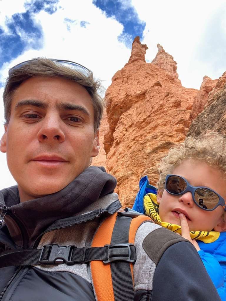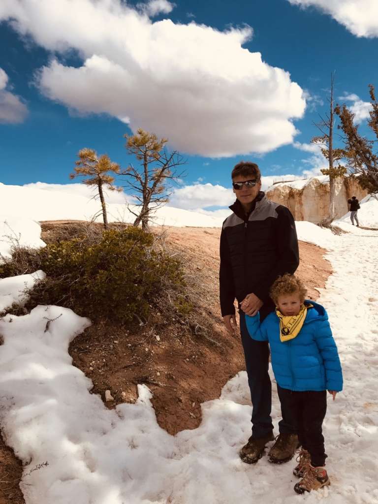 Arrivés à Bryce Canyon, Noah sort de la voiture et 30 secondes plus tard j’entends Virginie qui râle et demande à Noah de sortir de là. Je regarde et il est enfoncé dans la neige jusqu’aux genoux.”Papa, tu peux me délivrer ? “ Ah, ok en fait il marchait dans la neige et s’est enfoncé d’un coup. Il ne peut plus se dégager le Loulou.