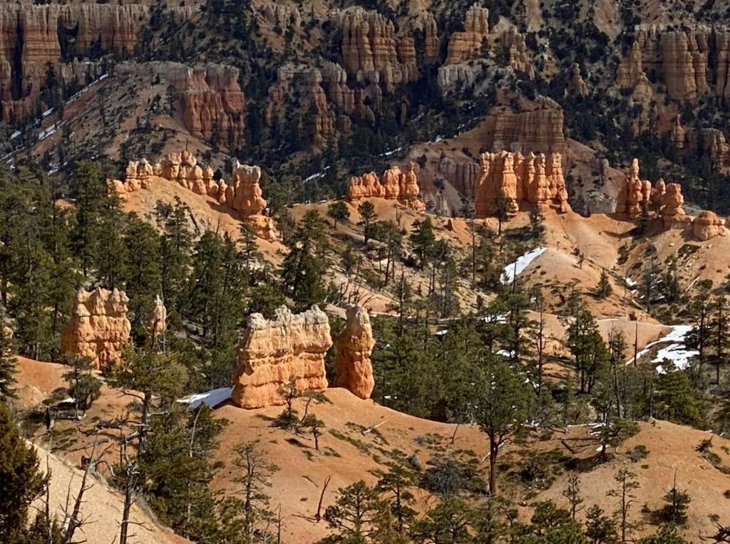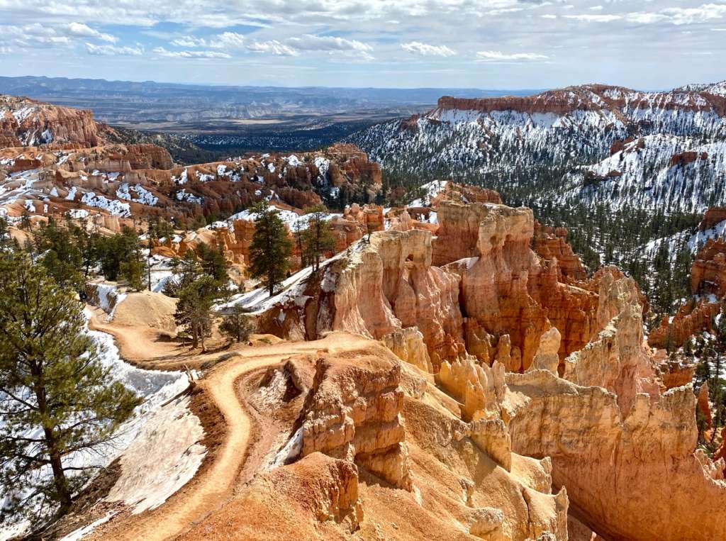 Un moment, on se dit qu’on va descendre par le Navajo Trail qui est bien indiqu » comme fermé, mais probablement plus bas ce qui permet sur le papier de l’emprunter. Mais il s’avère encore plus gadouilleux que le début de Queens Garden et franchement plus pentu. On renonce à s’engager la dedans et on reprend la voiture pour lui privilégier un stop à Observation point. L’occasion de gravir sous la neige sur le point le plus haut de l’amphithéâtre. ca vaut le coup car d’ici on voit l’amphithéâtre dans son ensemble.