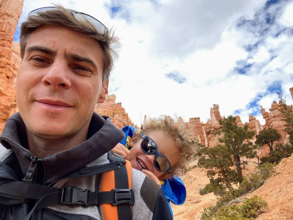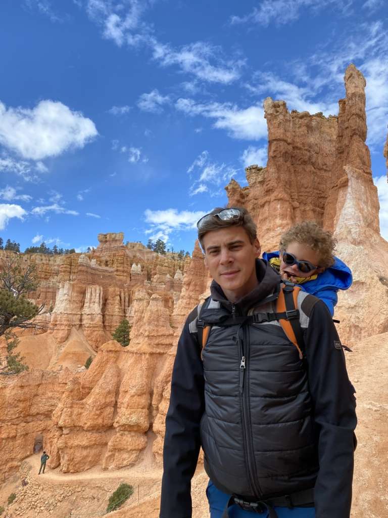 Durant la descente, on passe a plusieurs reprises dans des “portes” à même les hoodoos. On a du serpenter dans ces chemins étroits, souvent délimités par des pics abruptes pendant 30-40 minutes, et on n’a pas vu le temps passer. On arrive d’ailleurs à l’embranchement du Navajo trail qui est fermé. Dommage, on continue un peu jusqu’au fond de Queens Garden, puis on rebrousse chemin et bien sûr, Noah demande à être porté. Comme il est crado avec toute la boue, on le déchausse, et zou, dans le porte Noah. Avantage, on le remonte évidemment plus rapidement comme cela.