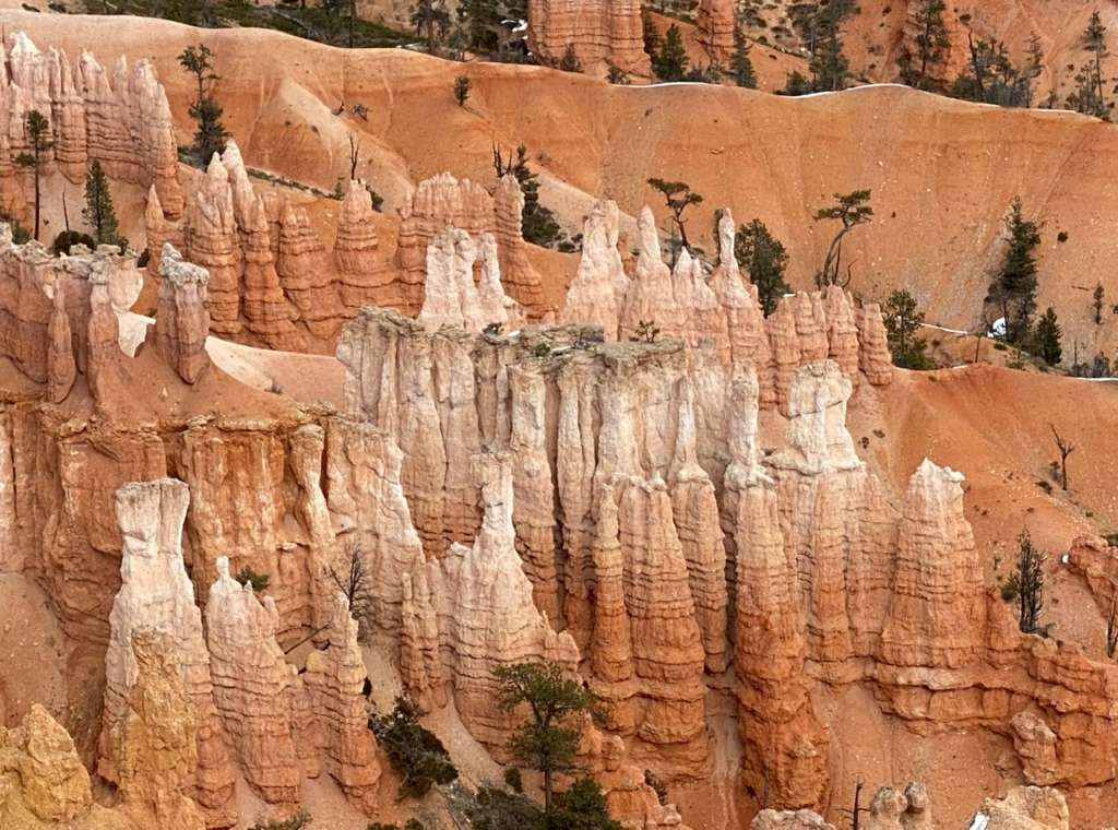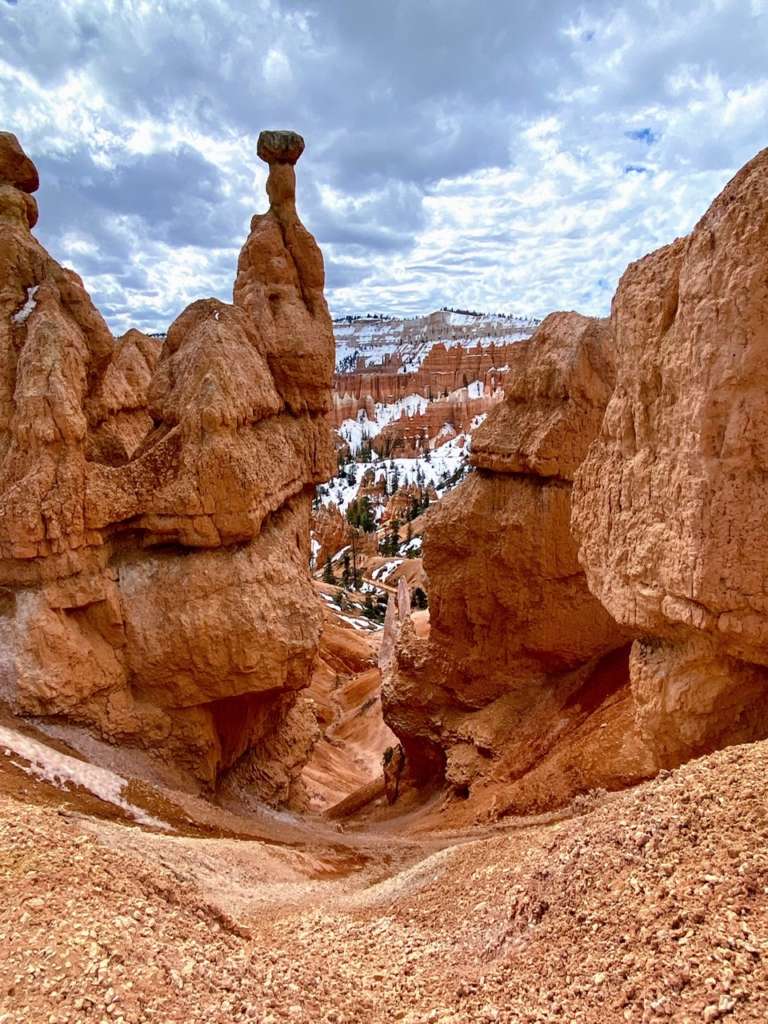 On s’équipe un peu pour la circonstance et 100 mètres plus loin, on découvre ce que l’on appelle les Hoodoos, ces formations rocheuses en forme de cheminées. Ici on parle d’ailleurs de cheminées de fées. Sous la neige ca donne un cachet différent des photos qui fleurissent sur internet et prises au coeur de l’été en plein cagnard.