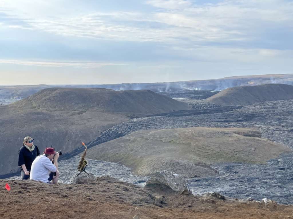 S’ils ont raison, si on patiente encore 1h30 au plus tard, on devrait commencer à voir un truc. J’en parle à Virginie qui gentiment accepte l’idée de rester jusque-là pour voir. Ici et là, les gens font passer le temps. IL y en a même un qui prend un photo son saxophone devant le volcan !
