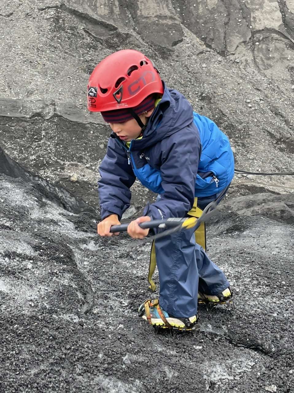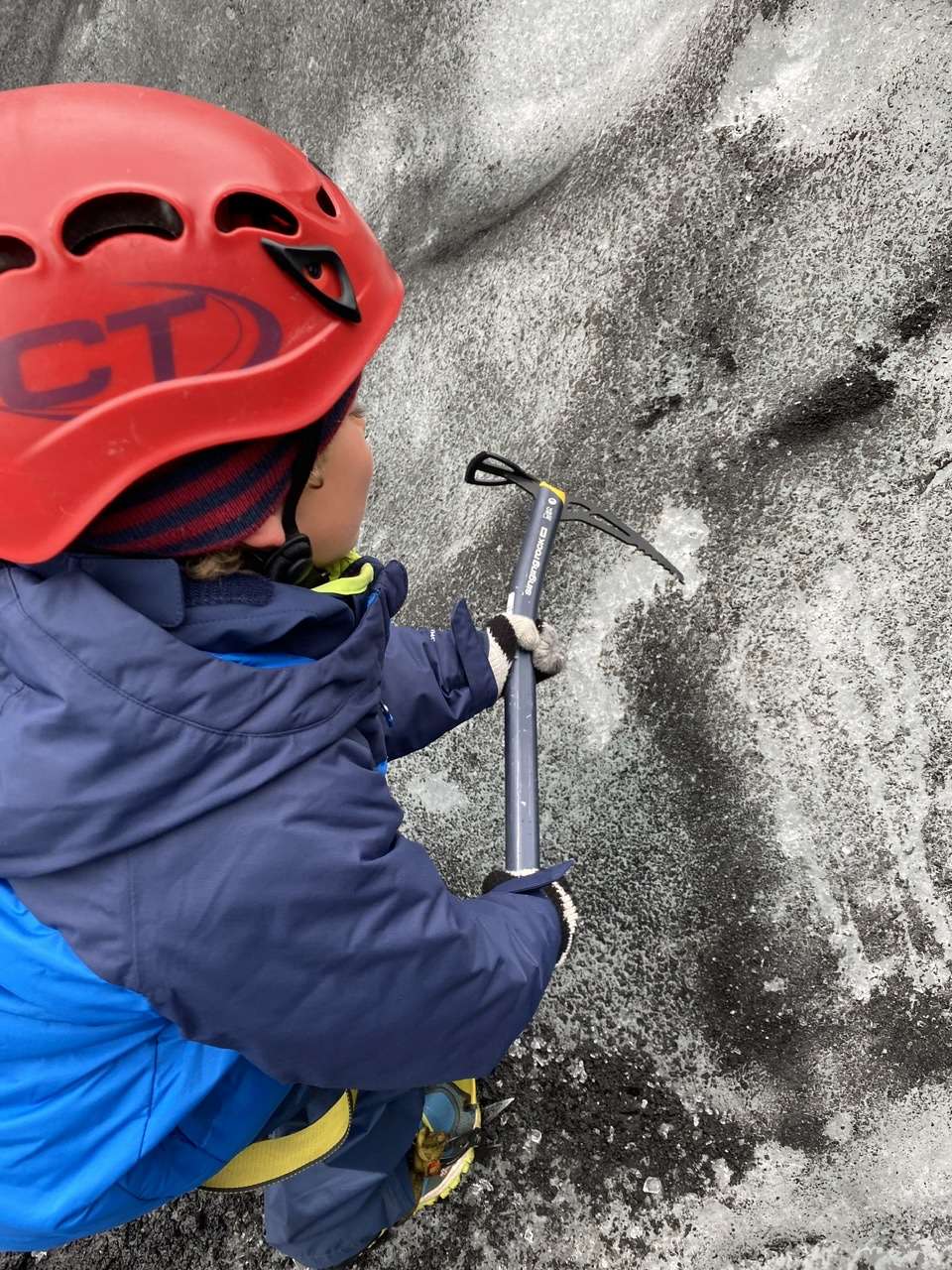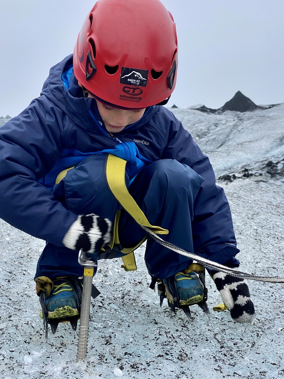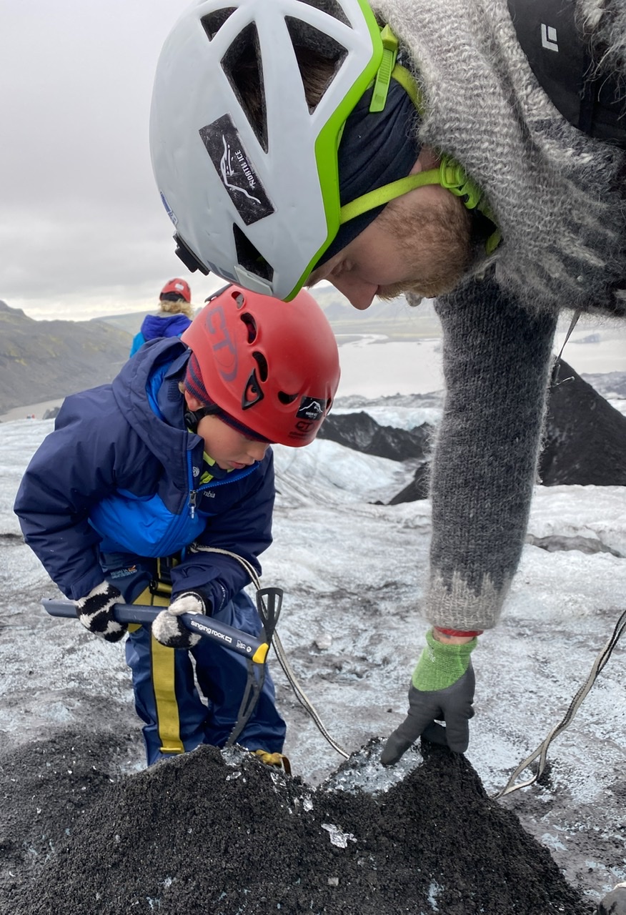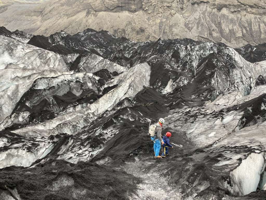 Mais passé ce moment, le « fit » passe tout de suite. Il finit par trouver des crampons qu’il arrive à mettre à la taille du pied de Noah en forçant bien avec un tournevis (c’était la plus grande inquiétude du guide), et on part avec le matos sous le bras vers le glacier. Il y a 20 ans, du parking on aurait chaussé les crampons direct mais vu que le glacier a reculé de près d’un kilomètres on a un peu de marche à faire.