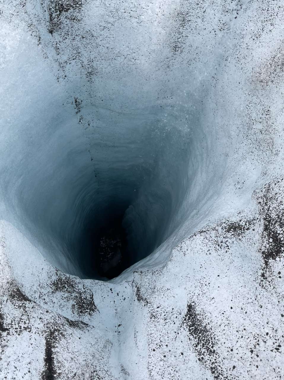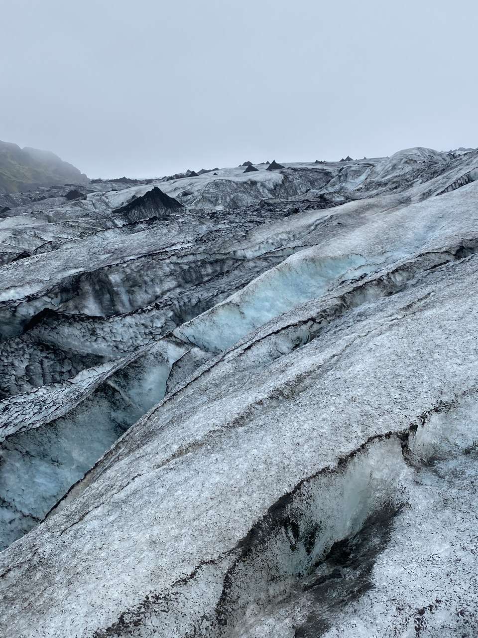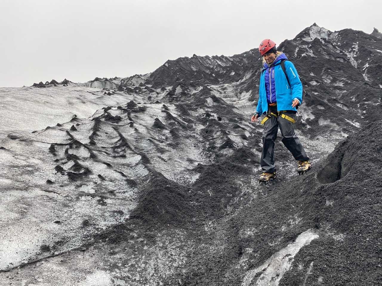 On retrouve même à de nombreux endroits une fois qu’on arrivera sur la partie haute du glacier de grands cônes noirs de cendre qui résultent du fait que l’eau creuse des trous dans le glacier. En tombant, l’eau fait fondre la glace au-dessous et ne laisse dessus que la cendre qui fait des cônes parfaits. Le glacier bouge ensuite et les cônes qui étaient au fond des trous se retrouvent plus tard au-dessus du glacier.