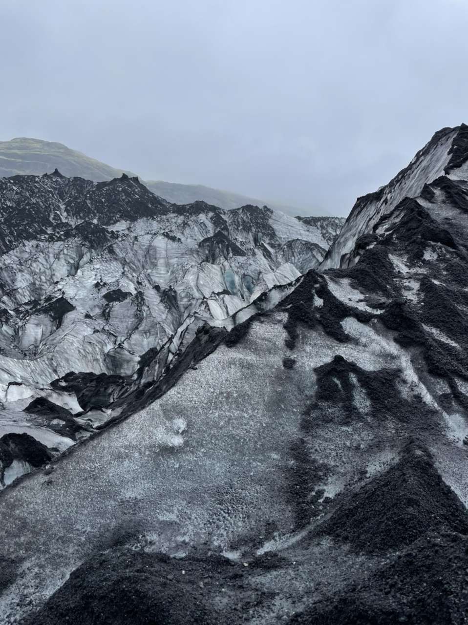 Le glacier Solheimajokull est très atypique de ceux qu’on a déjà fait avec Virgine en Patagonie, Nouvelle-Zélande ou Groenland. C’est un glacier que je qualifierai d’en noir et blanc.